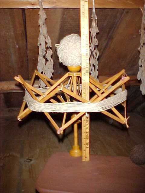 HSP / w04261 Swift Umbrella swift, strings still on corners. Gift of Roland Howard, June 1981 *Crossfiled R.H. Clamp on table top folding arm yarn winder, 19" dia.