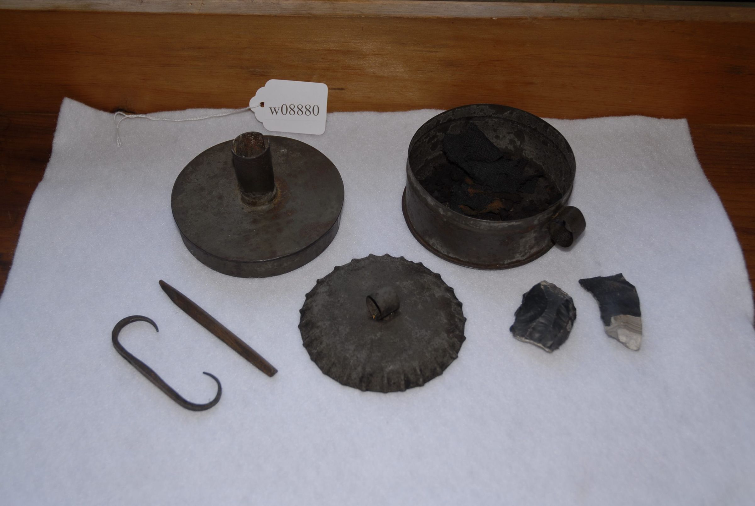 Tinder box with tinder in bottom. Also stricker.