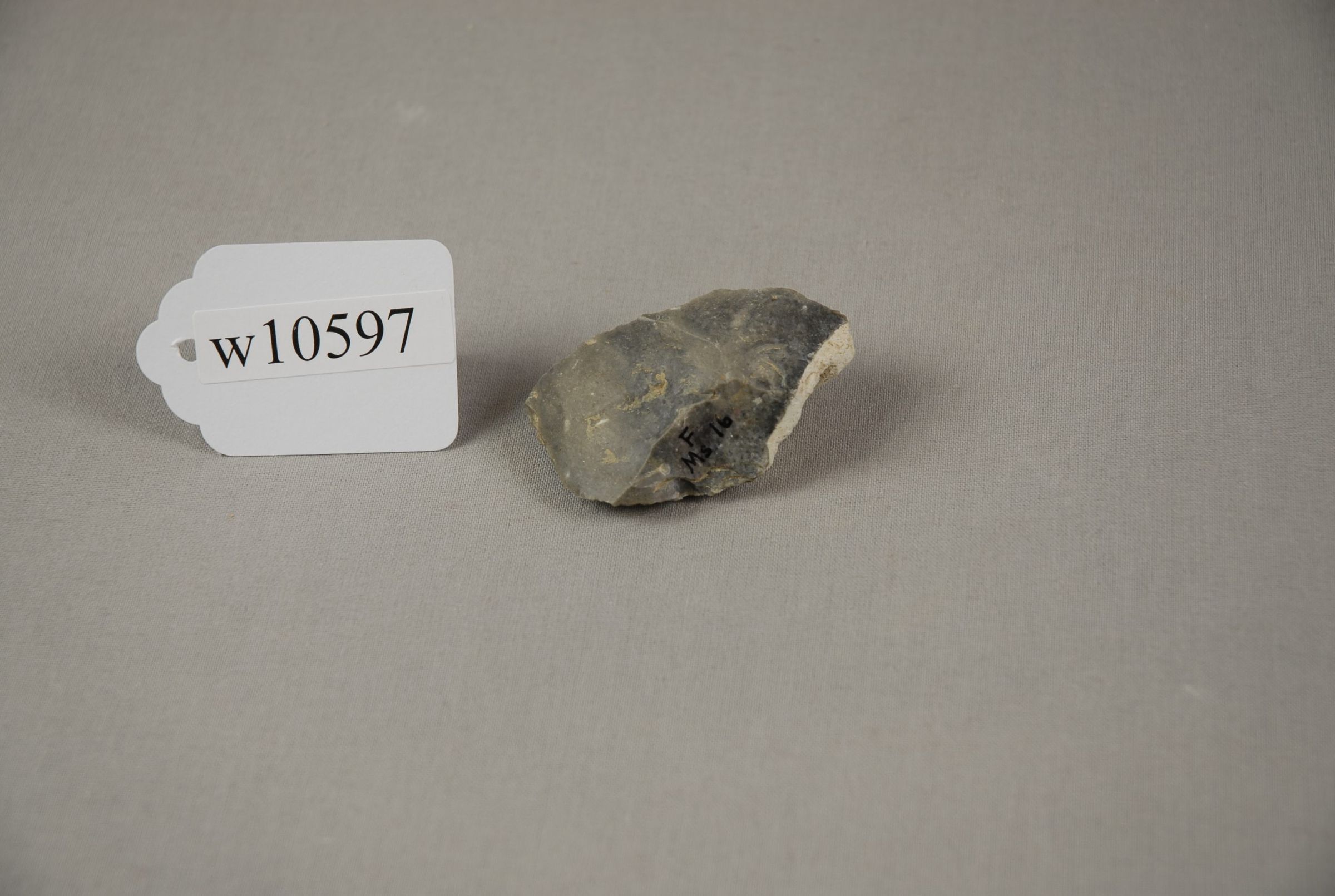 F Ms(f) / w10597 Flaked flint tool, thick Mousterian Cave du Placard, Charente, France 16 De Marat, Purchased 1916 by J.H.W.