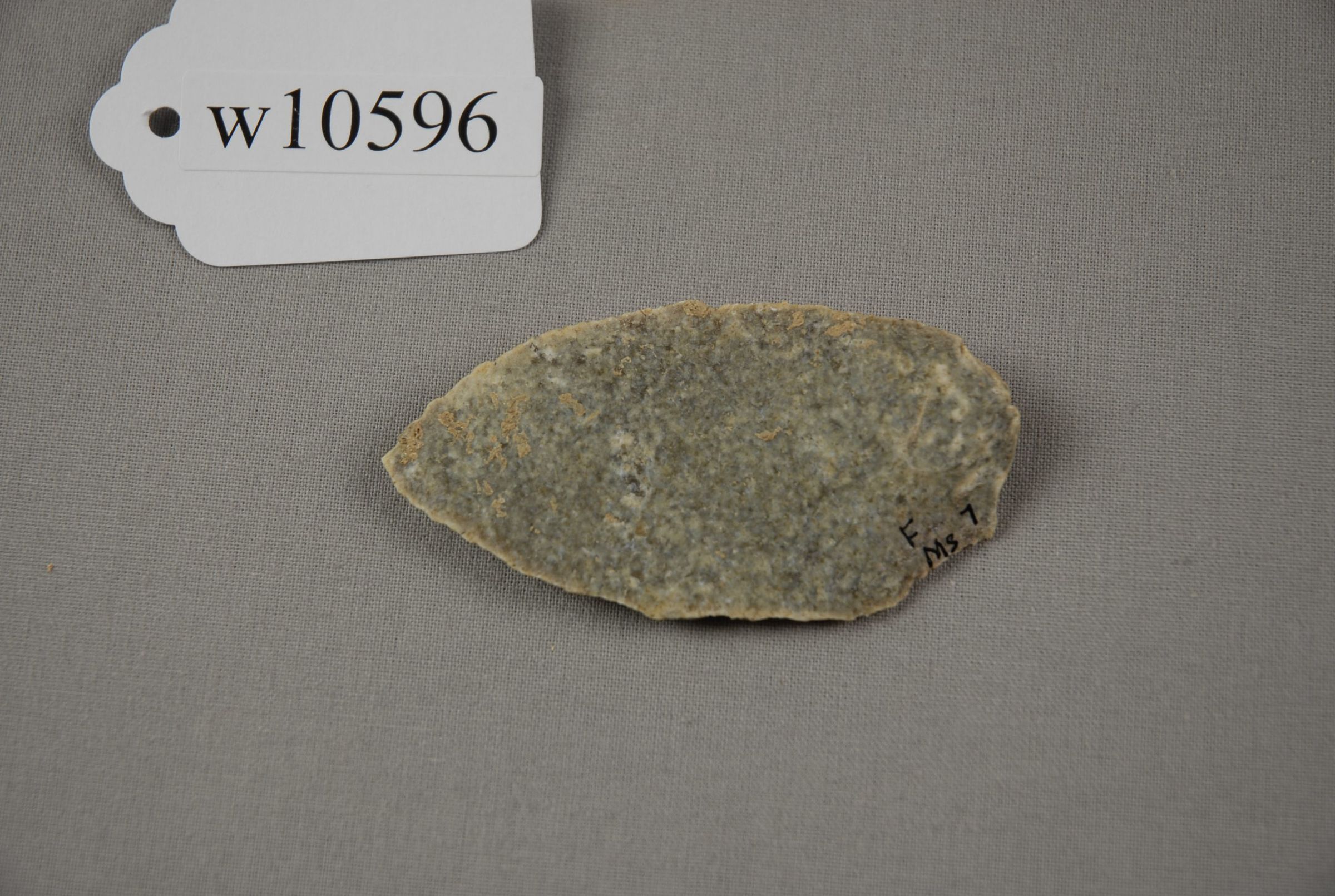 F Ms(pt) / w10596 Flaked flint implement, pointed Mousterian Cave du Placard, Charente, France 7 De Marat, Purchased 1916 by J.H.W.
