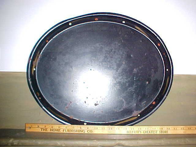 HUP / w04557 / PH Metal tray, finish wearing off. About 21" long Black with small red & white dot design around edge. Gift of Mrs. Edward Hale. Tray (toleware?)