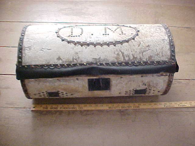 American hide covered stage trunk with initials "DM" in brass tacks. Iron hardware, round body with flat bottom. 24" l.