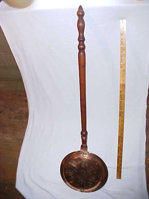 w08927 Ornate bed warmer with ring. Turned handle. Total length: 41 1/2"