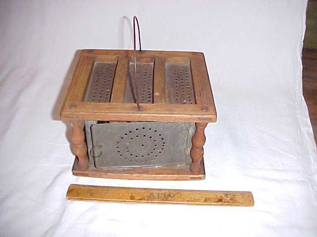 HKB / w04306 Foot warmer for sleigh from Corbett family of Corbettsville, NY. About 1850? American wood and tin cricket box footwarmer. 9" Footwarmer (stove)