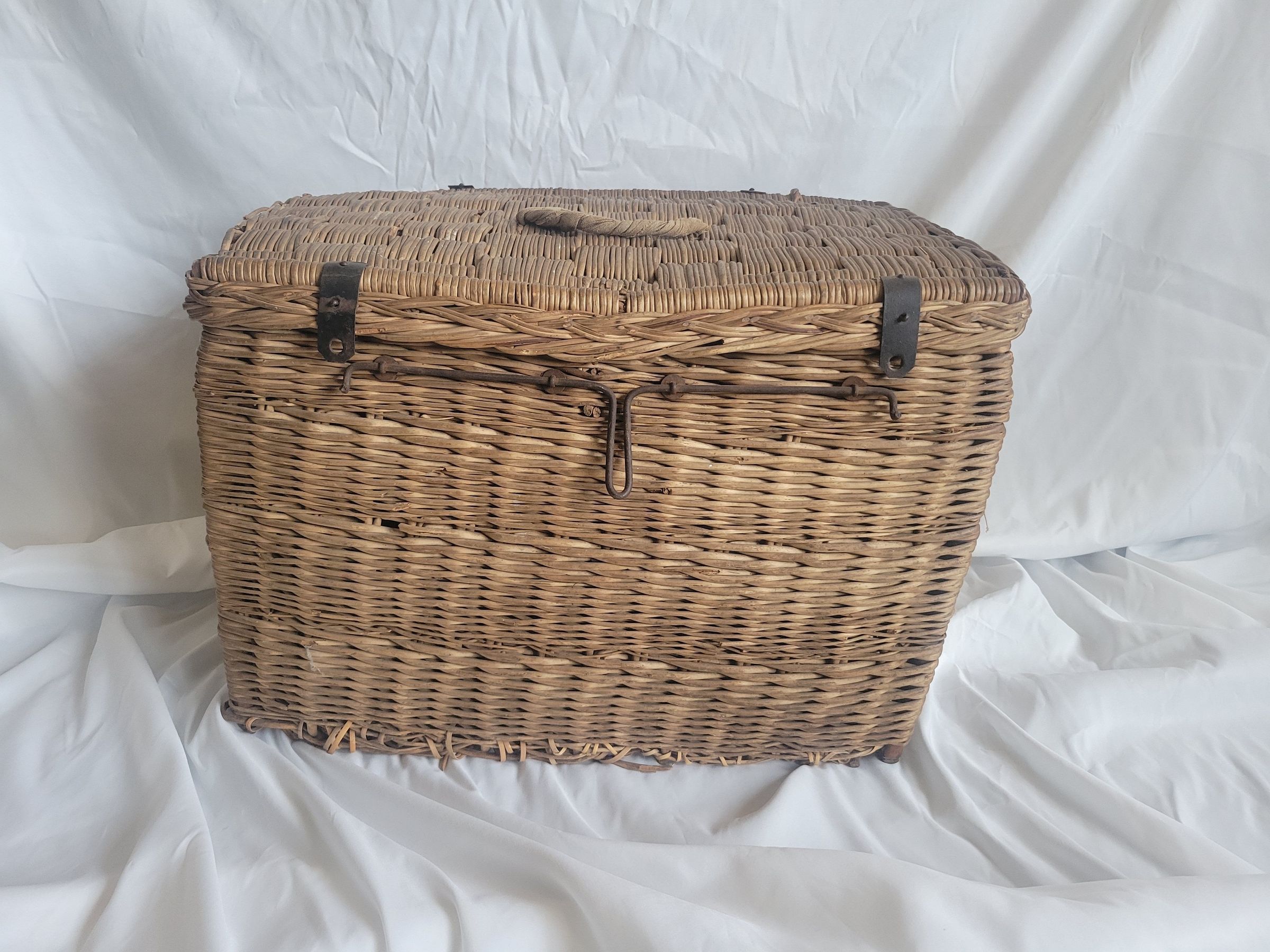 A large woven basket with metal hinges and closure. The handles at the top and right side of the basket are made from twisted fabric, there is no handle on the left side. The bottom of the basket is loosening, with some pieces missing, but the basket is otherwise in good condition.Collection