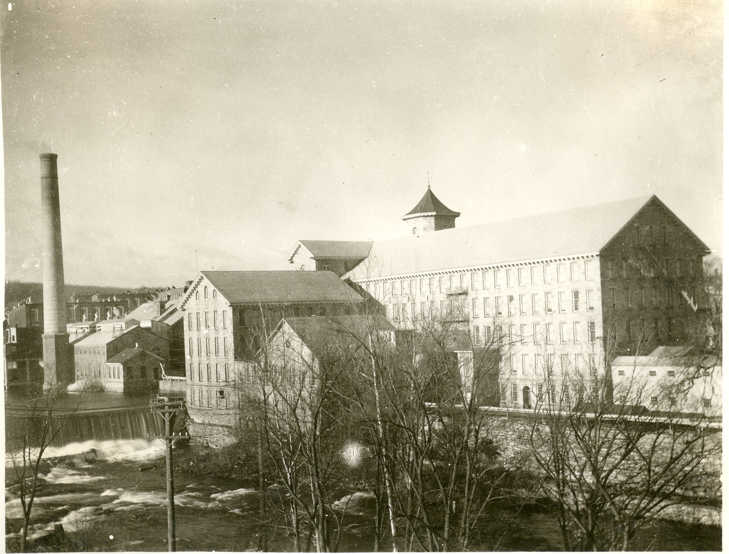 Black and white photographic print of the American Thread Company's Mill No. 2, Willimantic, CT, taken from across the Willimantic River looking north. No date.Photograph Details