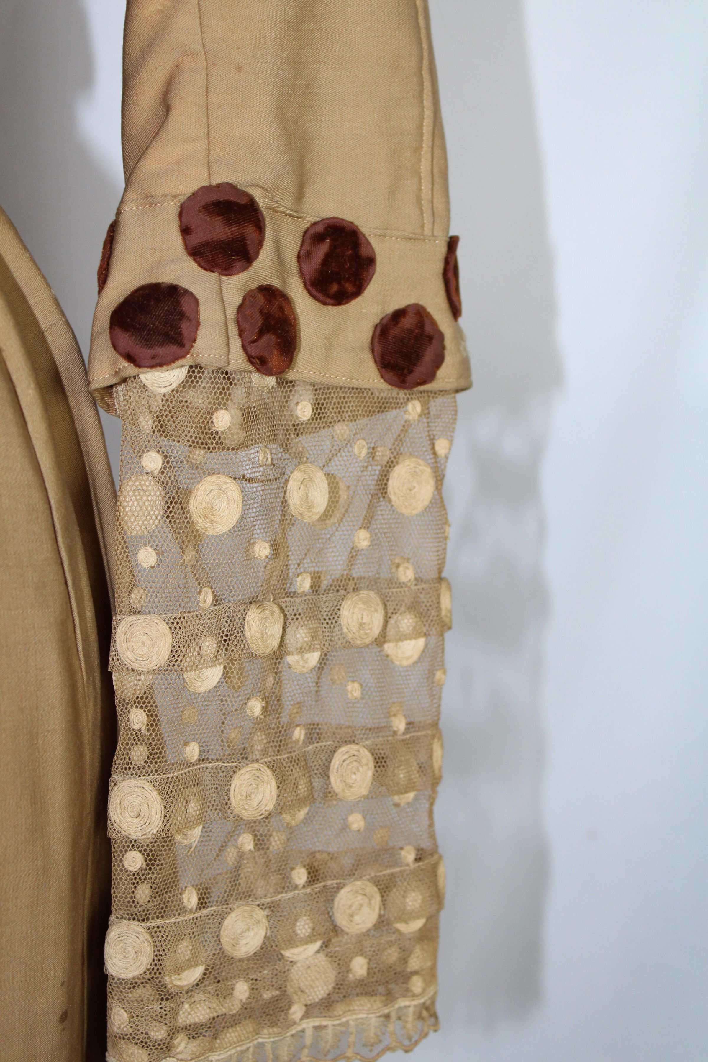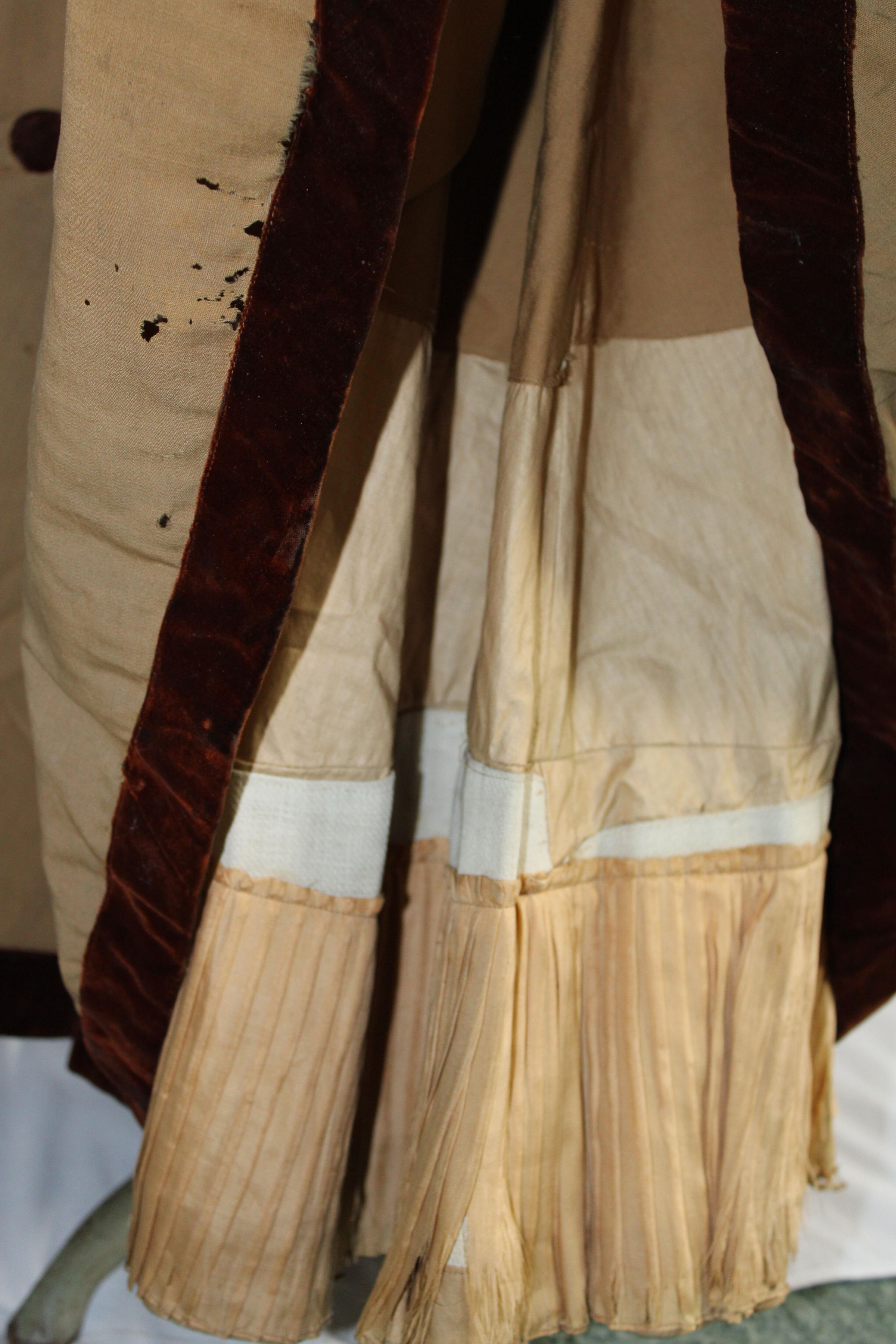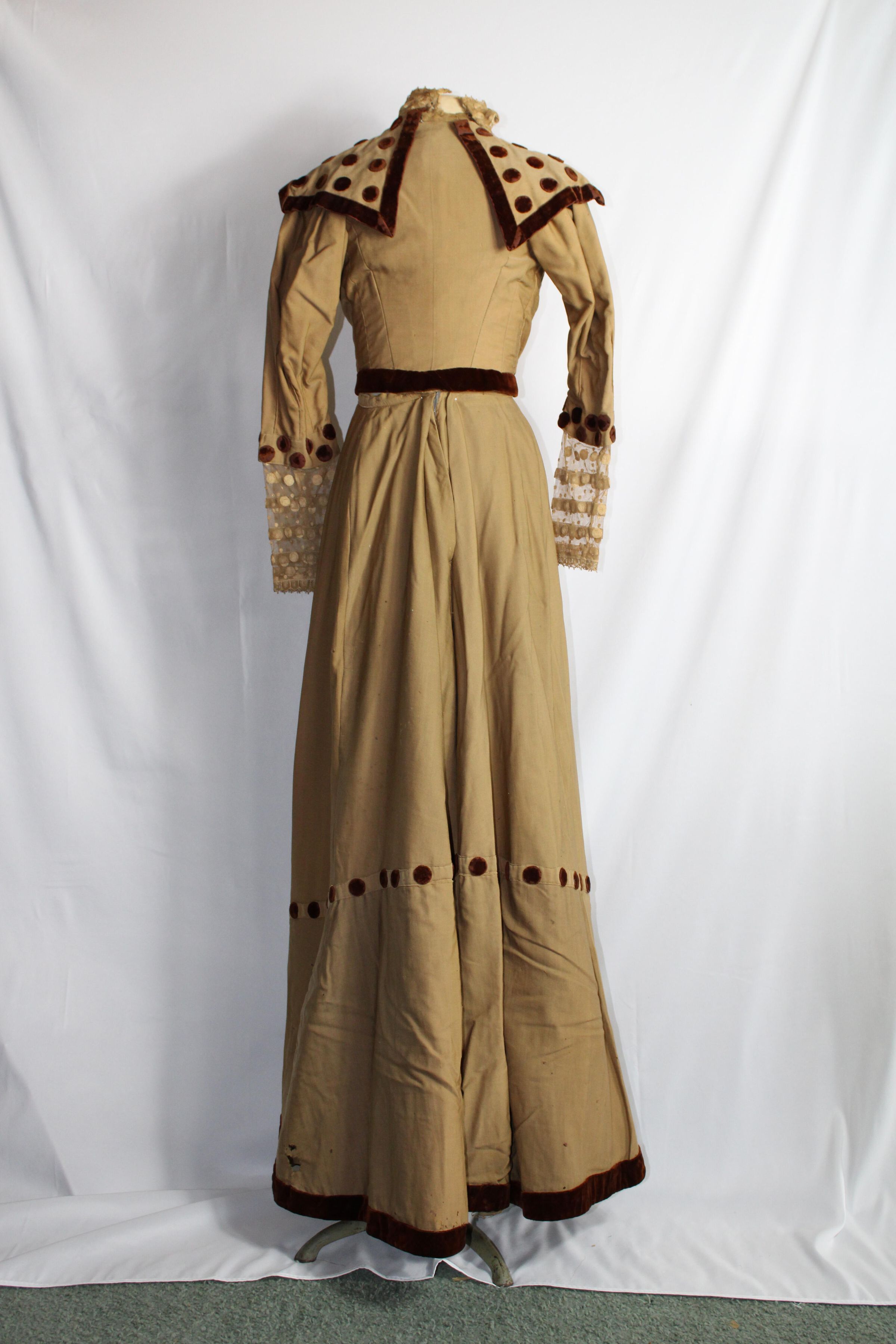 An Edwardian dress, likely a day or afternoon garment. Consists of a skirt and boned jacket. Made of silk with velvet details at the collar, sleeve ends, waist, and skirt hem. The skirt lining is pieced.Collection
