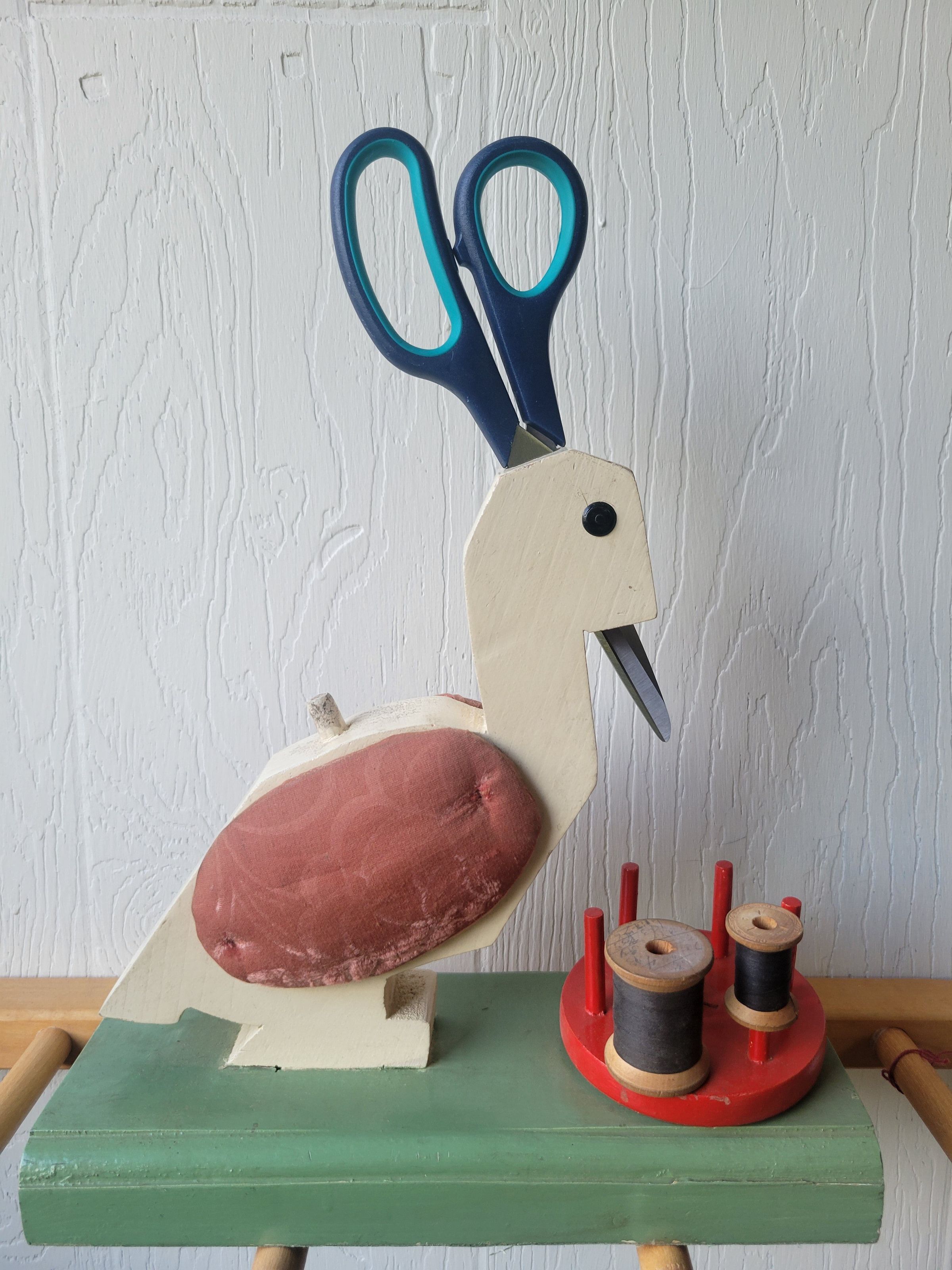 A holder for various sewing notions in the shape of a goose on a green base. The red disc with spindles spins freely and is meant to hold spools of thread, a pair of long thin scissors may be inserted through the top of the goose's head to create its beak, the wings of the goose are padded pin cushions, and the small spindle on its back is meant to hold a thimble.Collection