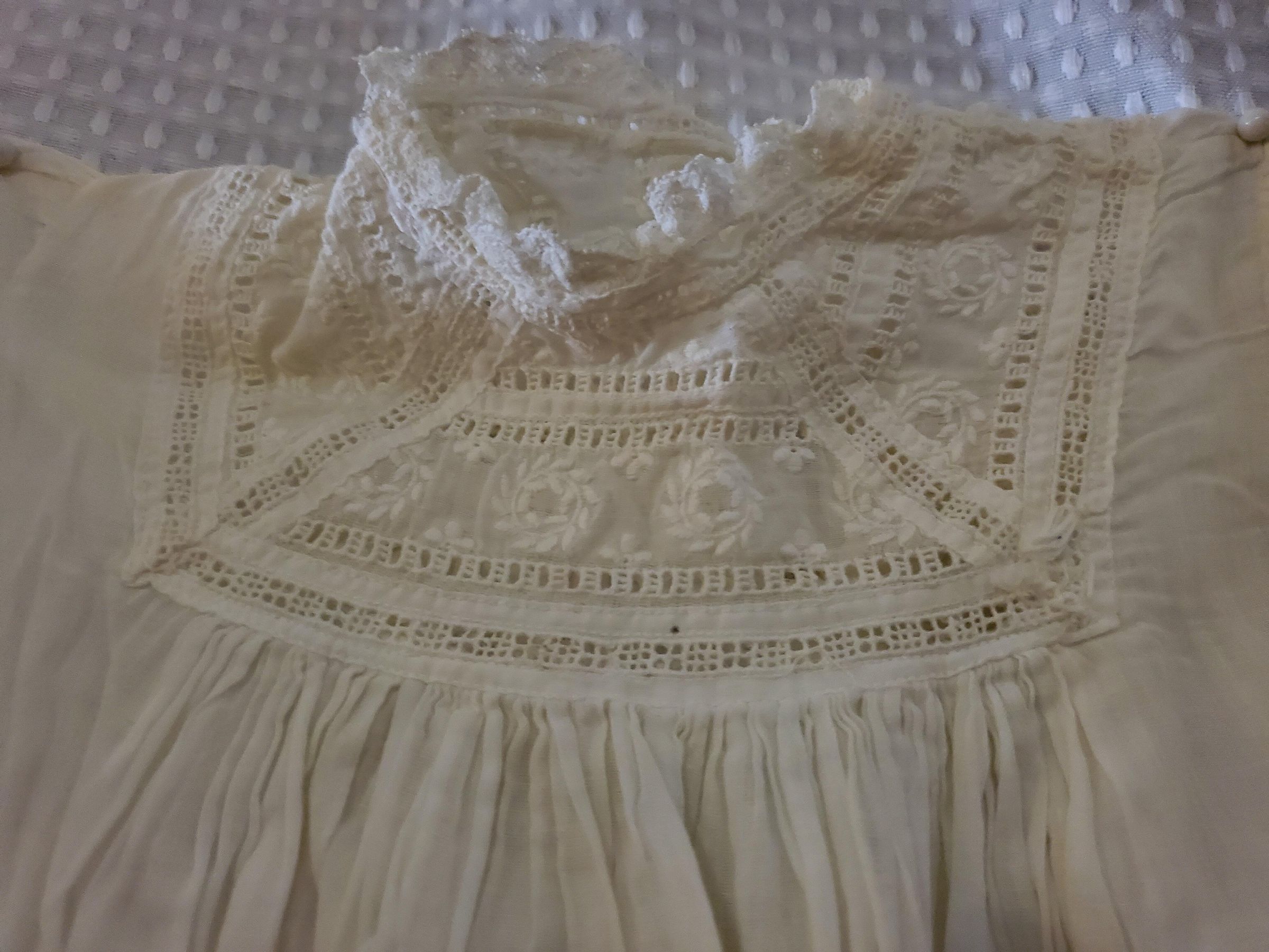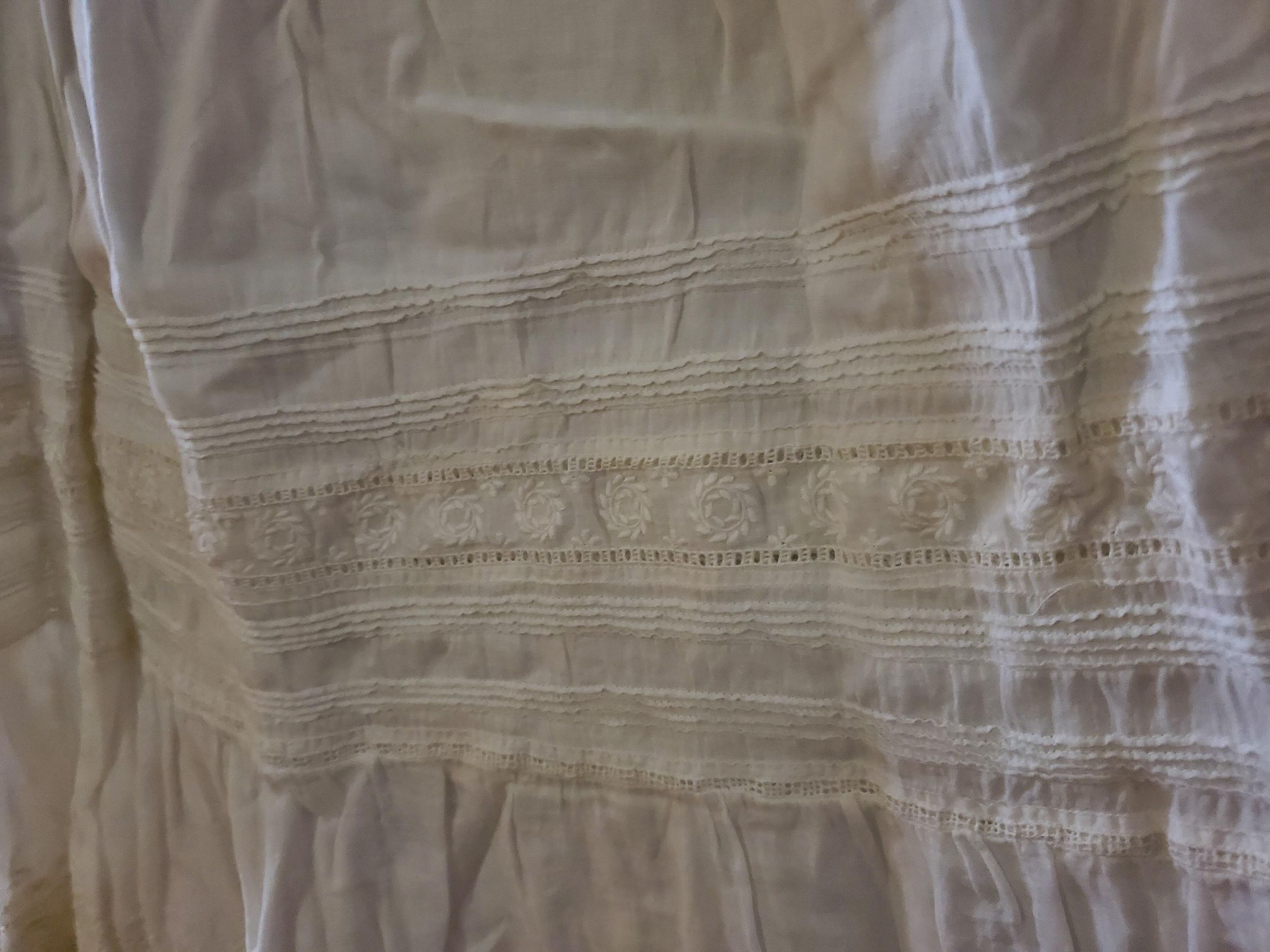 A christening gown used in 1905 for Paul Bilodeau Senior's children. Gown includes entredeux, white work, lace insertion and other heirloom techniques.Created By