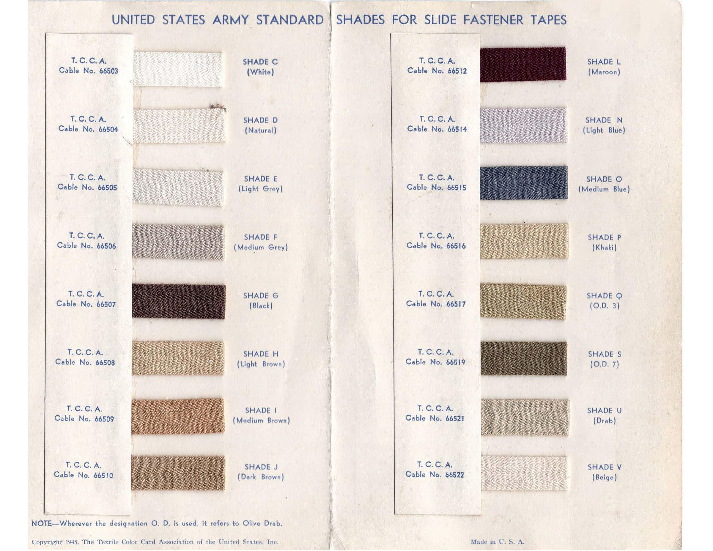 Color card sampler for textile mills to recreate the varying color of woven tapes used by the Army in WWII.Created By