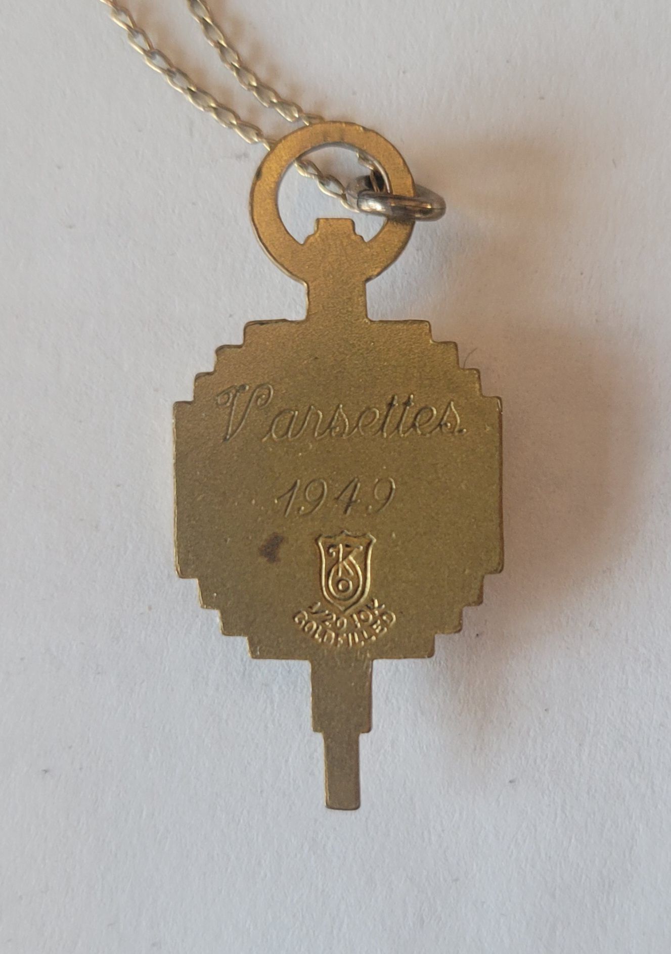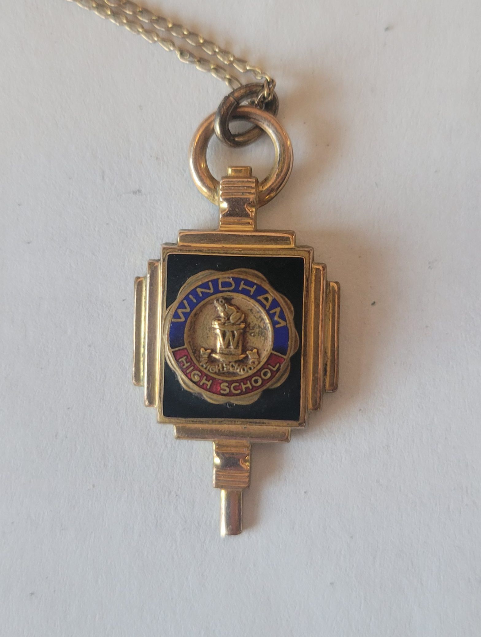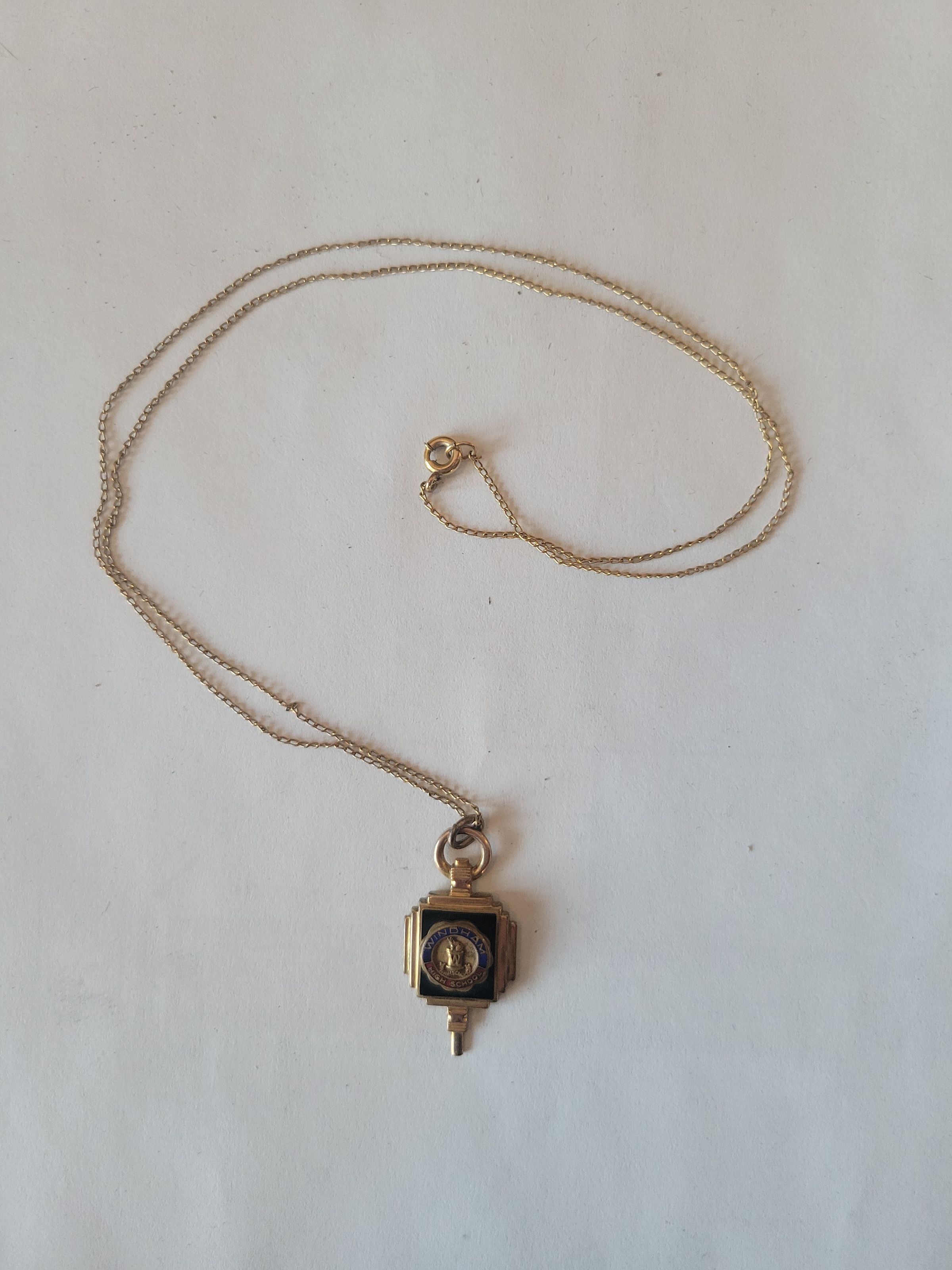 A gold chain necklace with pendant from Windham High School 1949. It features the blue and claret colors still in use at Windham High School today, and is engraved on the back with the word "Varsettes" which was a word used for cheerleaders at the time.Collection