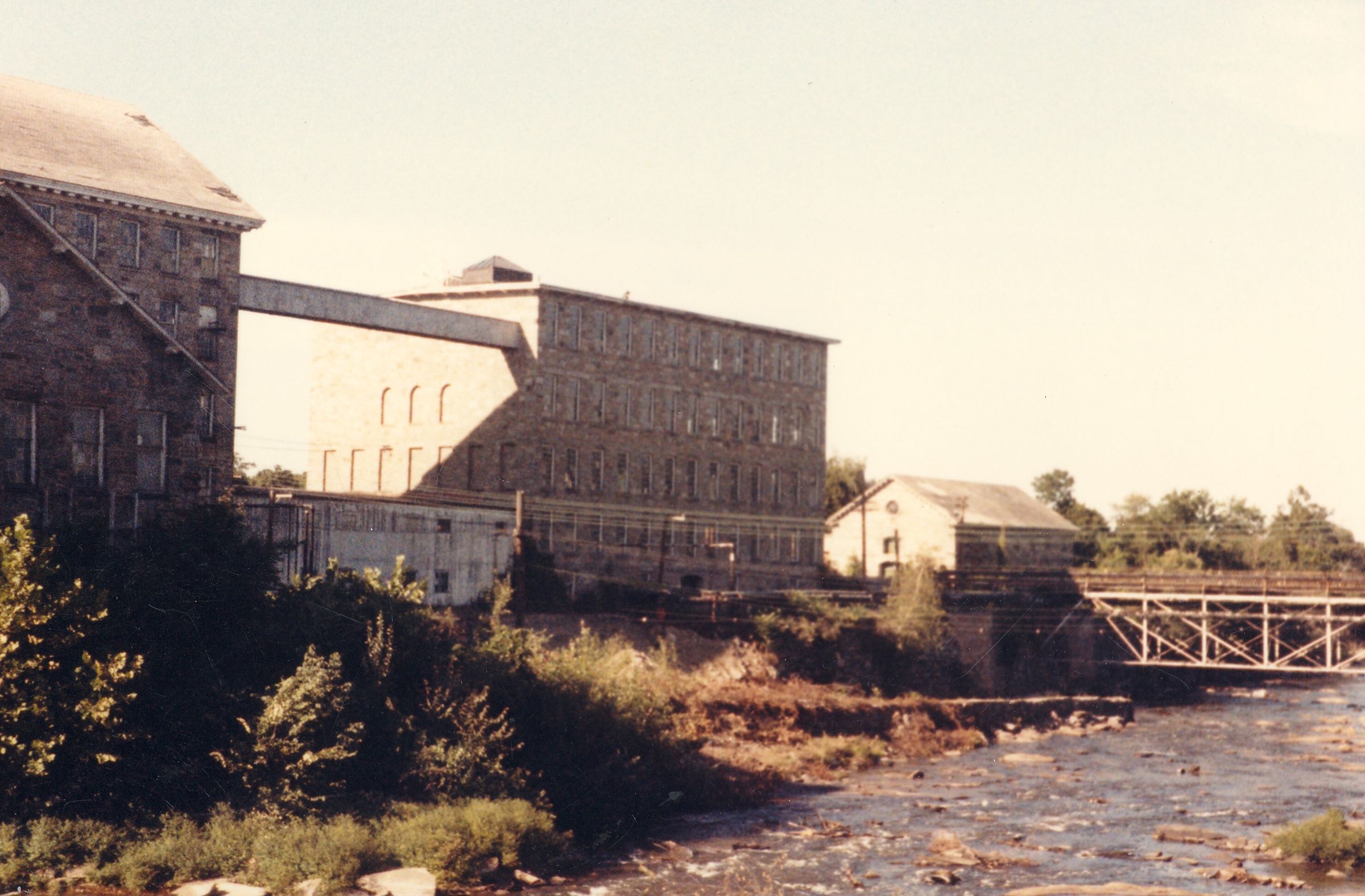 Color photograph of the east wing of Mill No. 2, the stable, tail race, and the Pine Street Bridge, American Thread Company, Willimantic, CT. Unknown photographer. Taken c. 1987, shortly after ATCO closed its Willimantic plant.Photograph Details