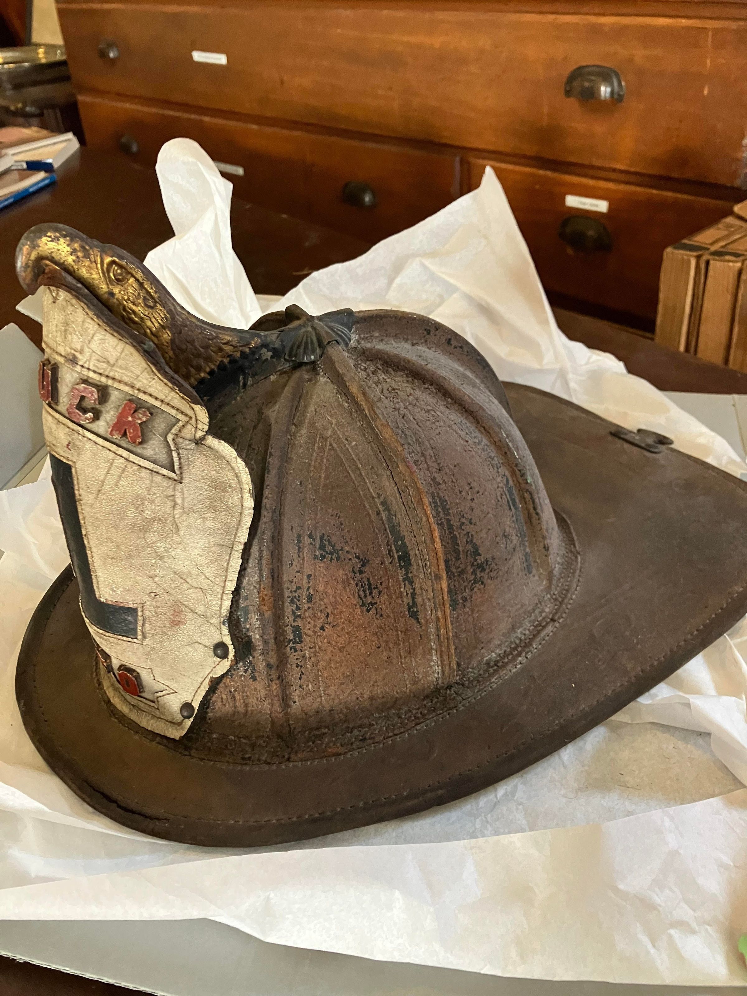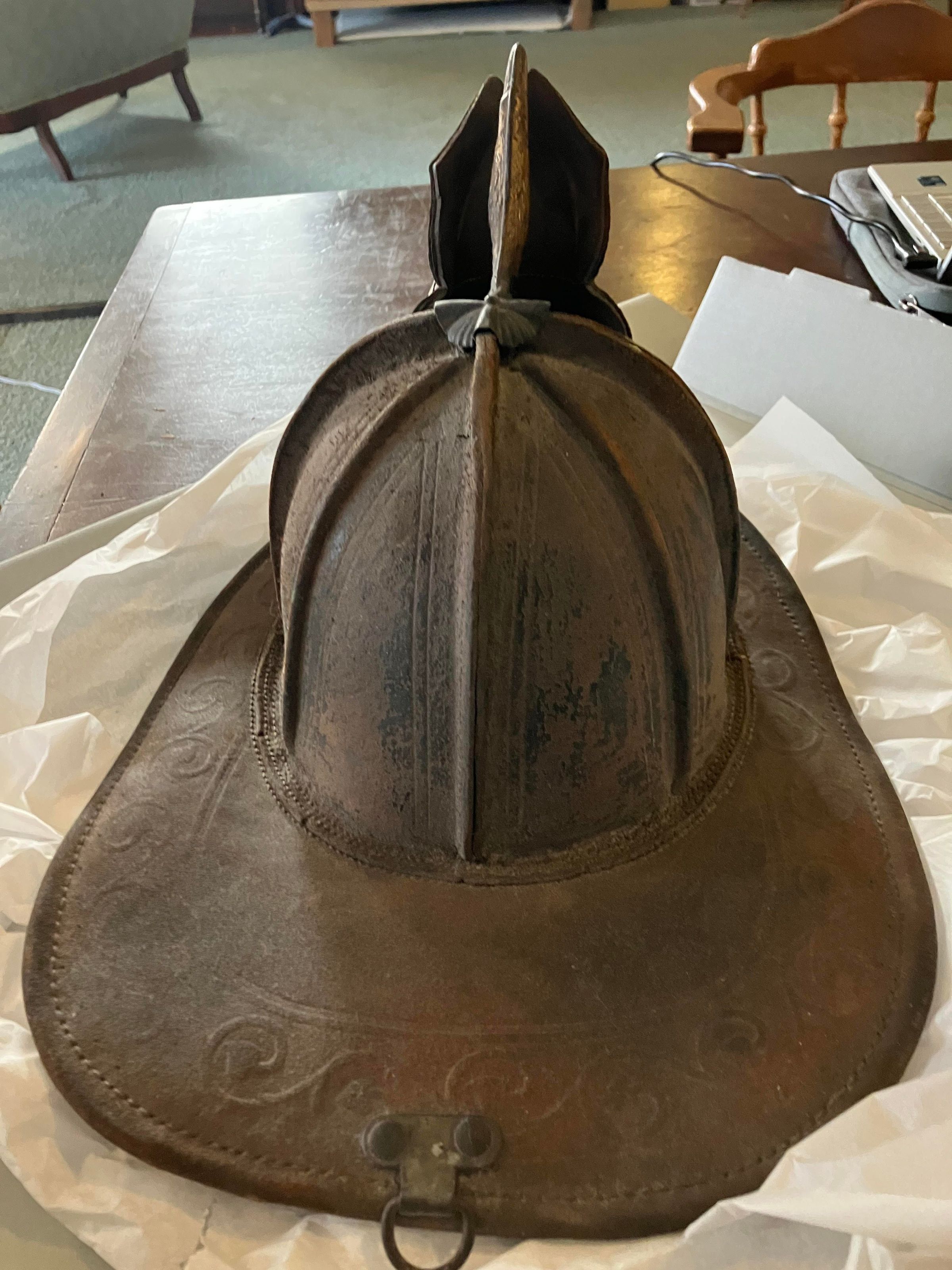 This image shows the front of the fire helmet. It is made primarily out of brown leather with white leather in the front which extends from the cap. The white portion appears to be bolted on. There is a rounded metal hook at the top of the white leather. The word truck is in red 3D block letters towards the top of the white portion; though the "R" is missing its outline can still be seen. There is a large "1" painted in black on the center of the white portion. At the bottom of the white portion is "WFD" in the same lettering as the "Truck" There is an embroidered border around the WFD which is rectangular with points on the right and left sides.