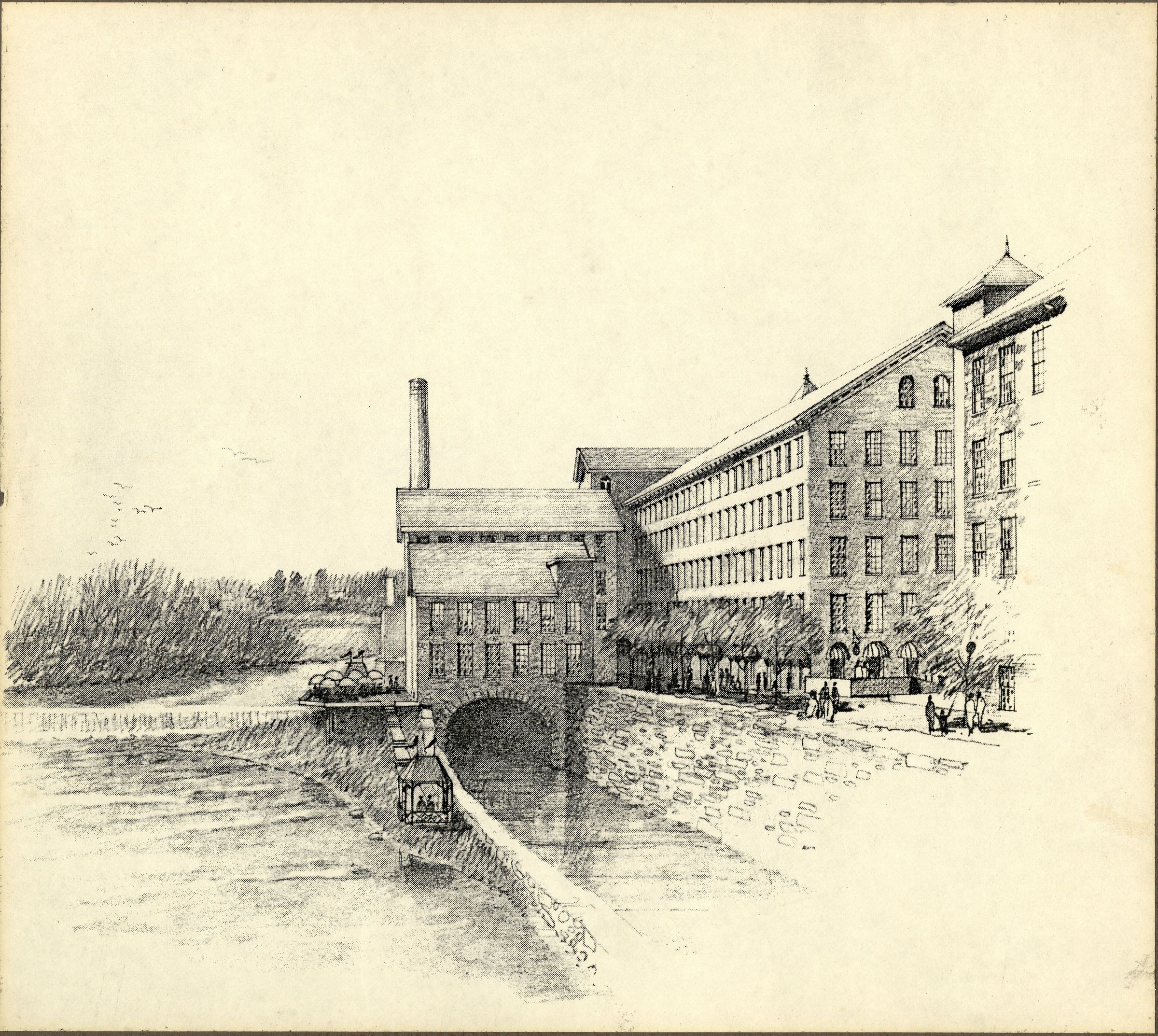 Print of a sketch of the back (south or river side) of the American Thread Company's Mill No.1, Willimantic, CT. Probably made c. 1990, after ATCO closed its Willimantic plant in 1985. Mounted on cardboard.Artwork Details