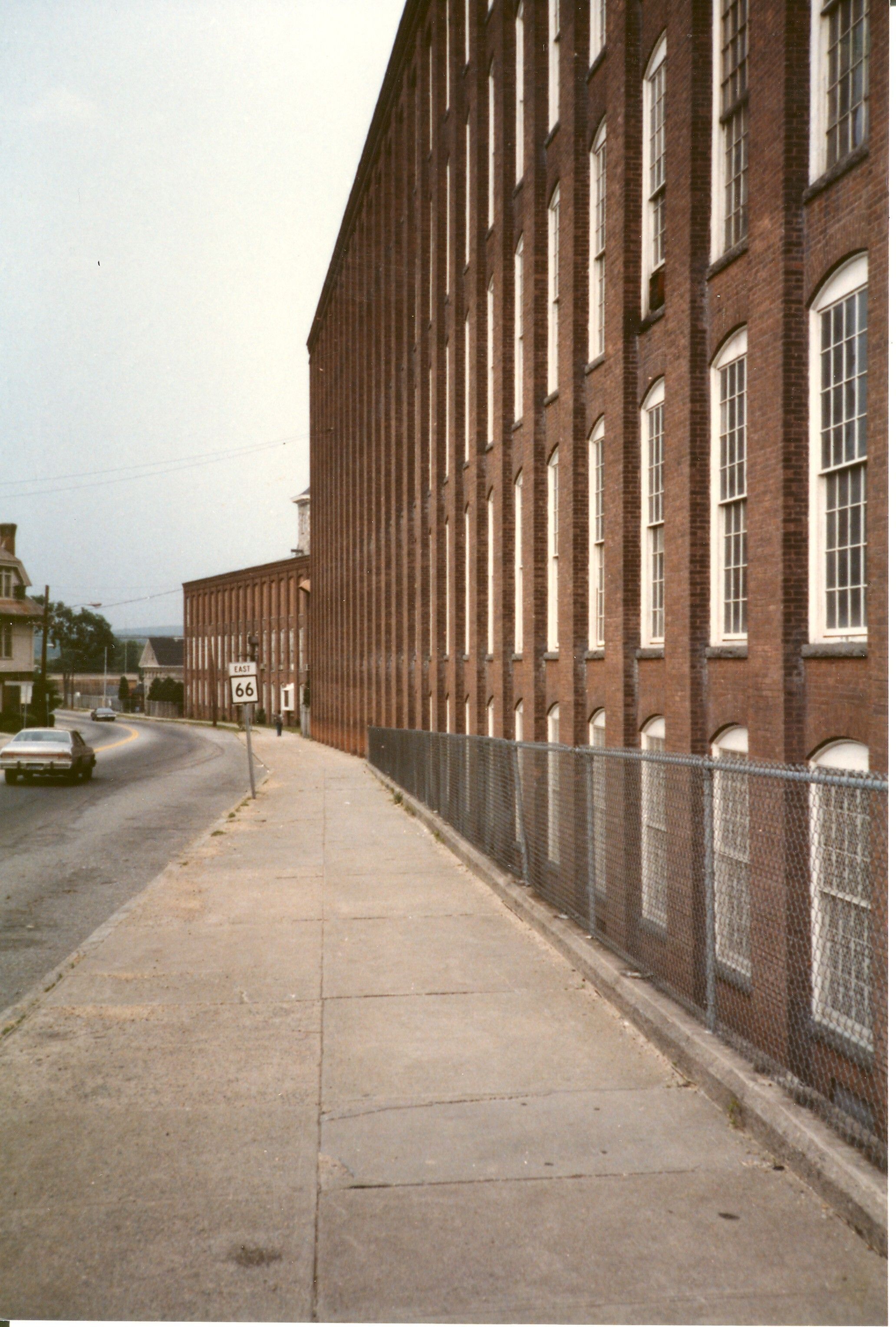 Color photographic print of Mill No. 6, with Bleach House in the background, American Thread Company, Willimantic, CT. Unknown photographer. Taken c. 1987, shortly after ATCO closed its Willimantic plant.Photograph Details