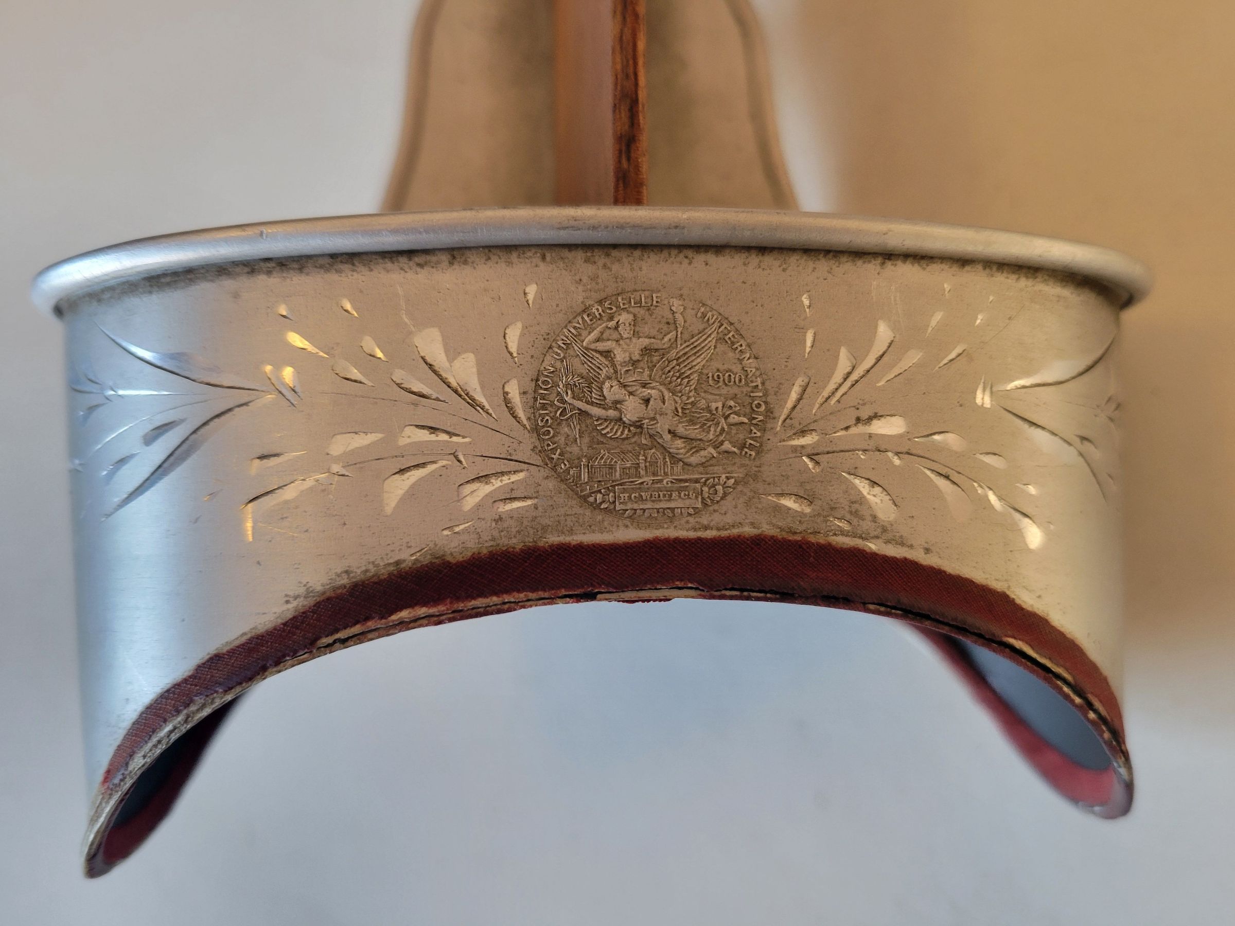 A stereoscope is used for viewing stereographs. A stereograph is a set of two nearly identical photographs, taken by a stereopticon, set side by side. This would be placed at the end of the stereoscope and viewed from the eyepiece. The result is an early version of 3D imaging. The design for the original stereoscope, the "Perfecscope," was unpatented and so produced by a number of further inventors and manufacturers, some of whom improved upon the idea and patented those improvements. This stereoscope was created by H.C. White and company for the 1900 Paris World Fair, or Expositions Universelles, and features his own patented folding handle design (1883). This particular stereoscope is missing the metal and wooden crossbar which would hold the stereograph, as well as the wooden handle. On the underside there is still the metal arrow which would have been inserted into the wooden handle, it is attached to a hinge which would allow the handle to fold flat for easier storage.Collection