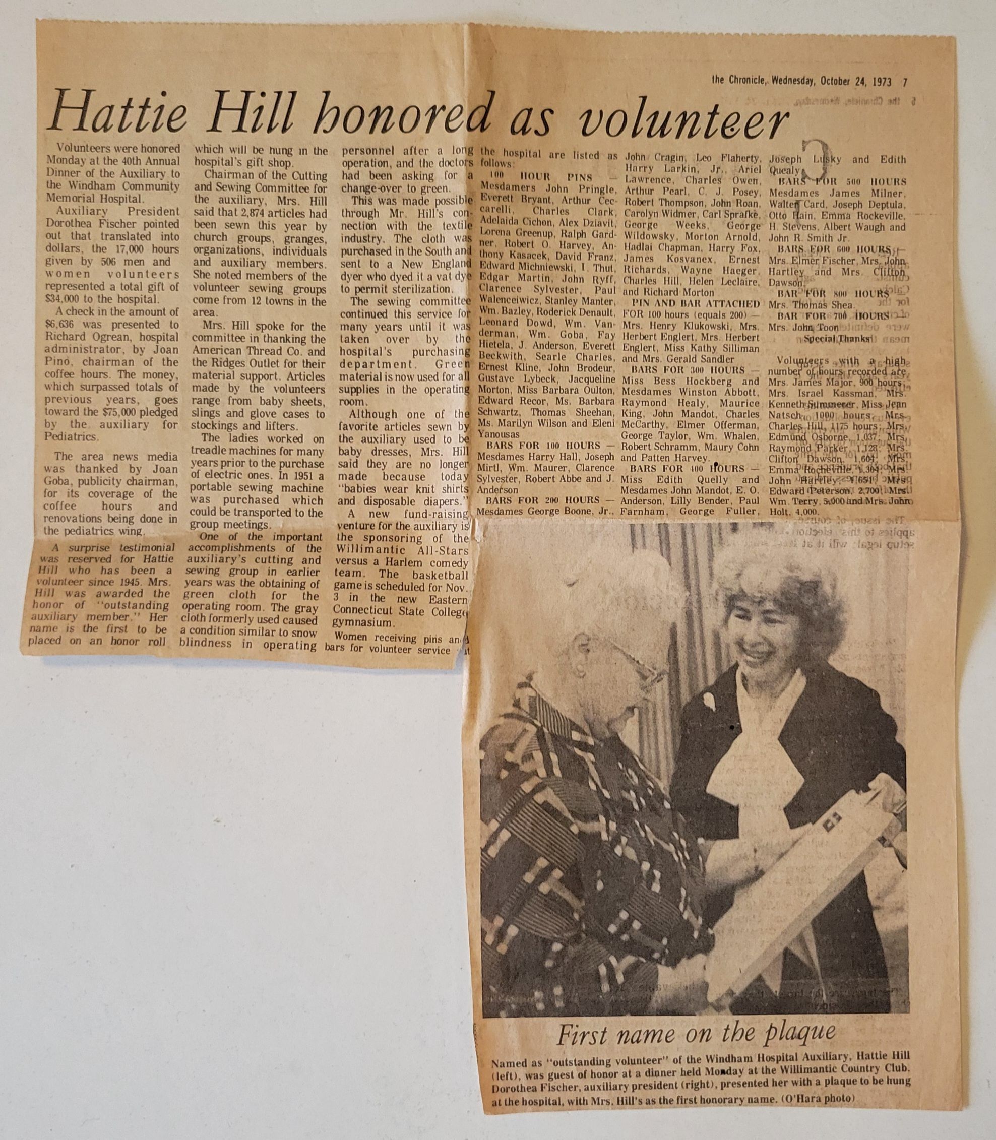 A newspaper clipping from the Willimantic Chronicle of the article "Hattie Hill honored as volunteer," dated October 24, 1973. The article details the 40th Annual Dinner of the Auxiliary to the Windham Community Memorial Hospital where all volunteers, prominently Hattie Hill, were honored and received pins and bars in recognition of their service. The accompanying photograph is of Hattie Hill (left) holding the plaque featuring her name, with the president of the auxiliary Dorothea Fischer (right). Photograph by O'Hara.Collection