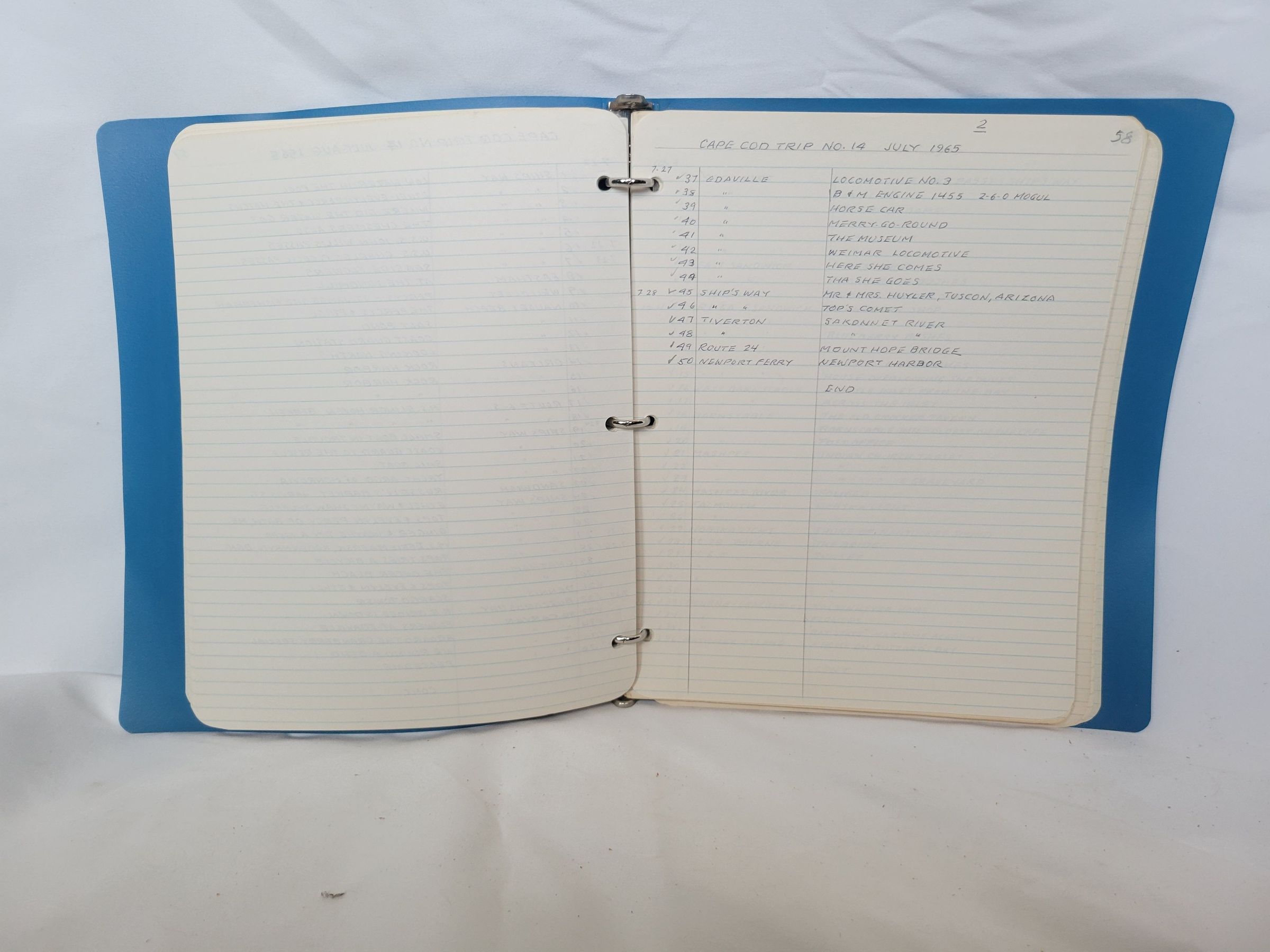 A list of slides compiled by Harold Nichols. The collection, housed in a blue plastic binder labeled "color slides," is made up of lined sheets of paper, each of which hosts a titled collection of slides with numbers and descriptions. The entries range in date from 1953 to 1967. The slides themselves are not included.Collection