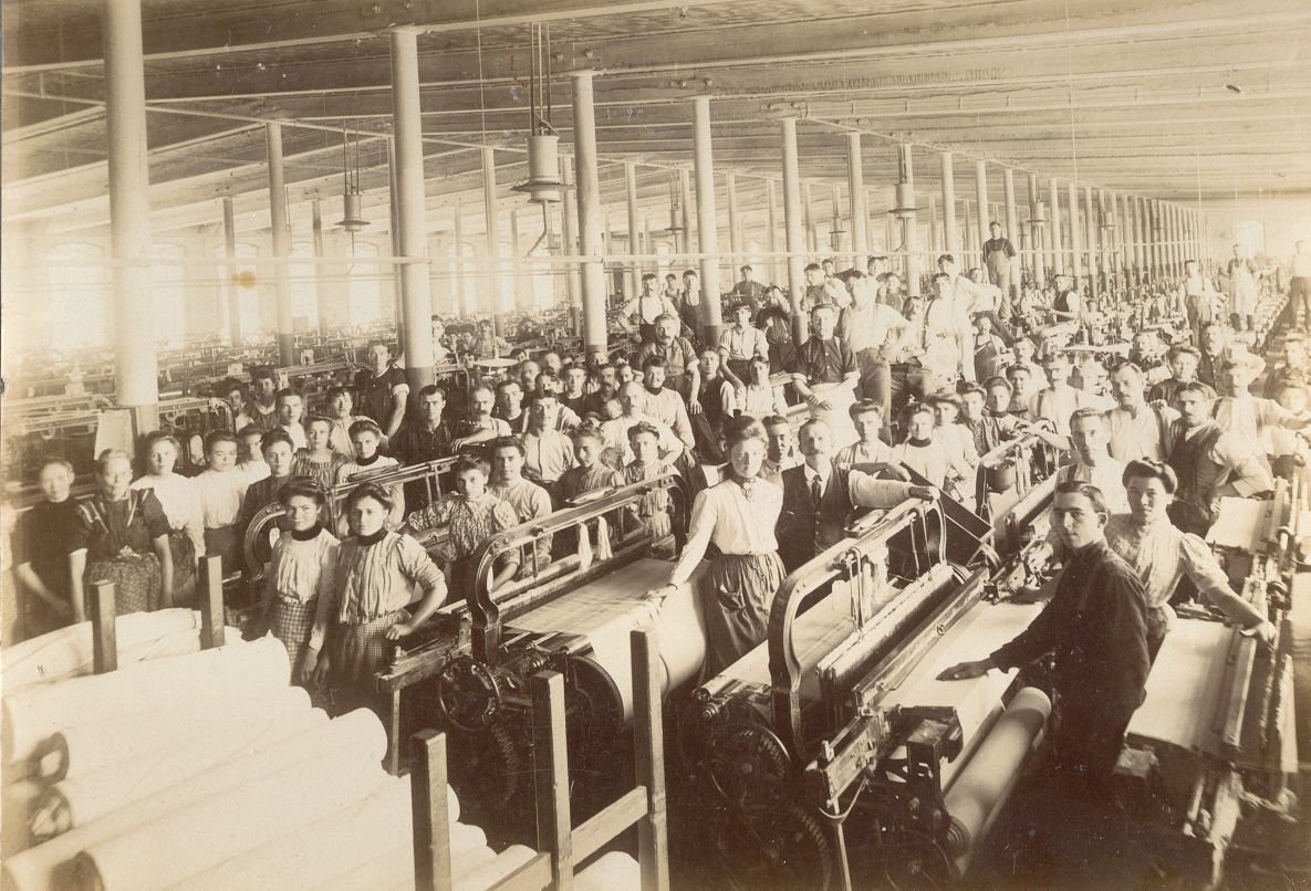 Photograph of weavers and other textile mill workers in a weave room in a textile mill, c. 1890. Looms shown. Location unknown.Photograph Details