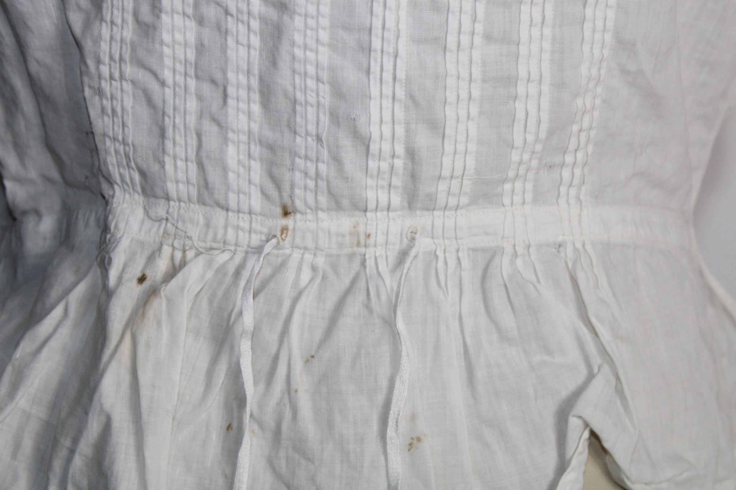 Corset cover with lace border at neckline. Decorated with 1/8 inch pin tucks. Drawstring waist. Button closure in front.Collection