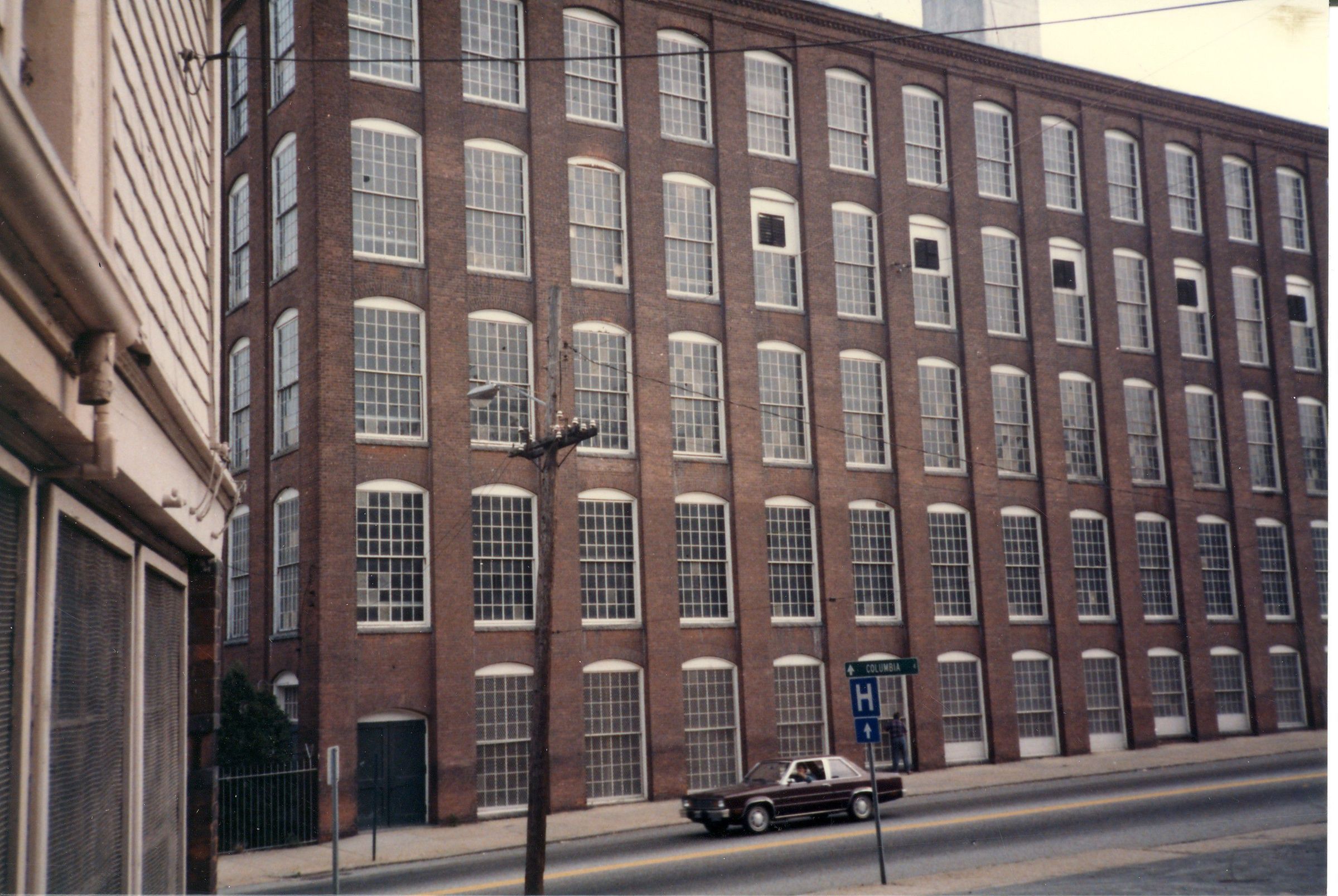 Color photographic print of Mill No. 6, American Thread Company, Willimantic, CT. Main Street side. Taken from just outside ATCO's main office building (now the Mill Museum). Unknown photographer. Taken c. 1987, shortly after ATCO closed its Willimantic plant.Photograph Details