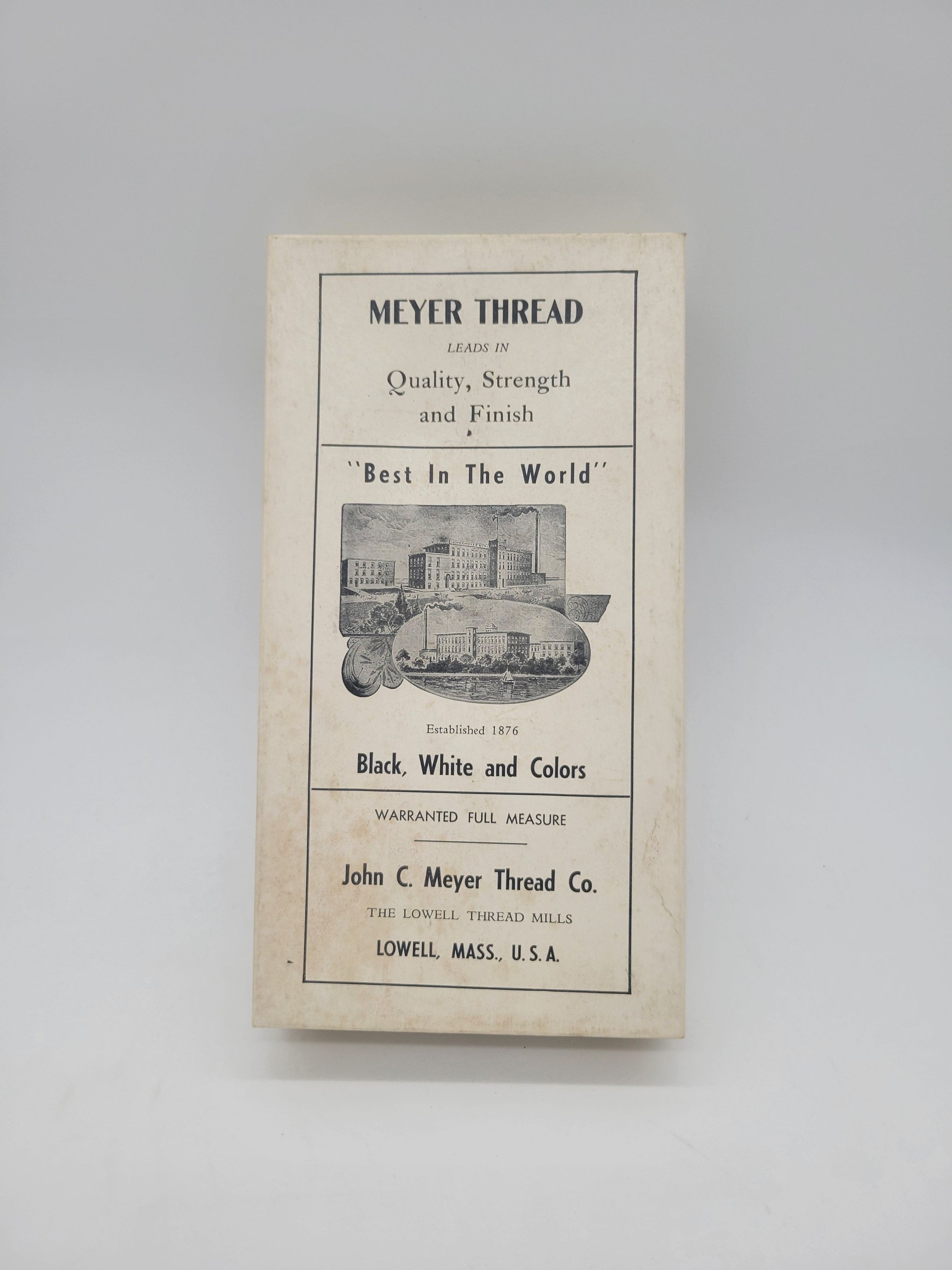 A box of thread from the John C. Meyer Thread Company. The company was founded in 1876 by John C. Meyer in Lowell, MA, though eventually they also operated out of Boston, MA. The company manufactured threads of various kinds, including a silk finish thread widely used in shoe and other leather stitching. The lid of the box reads" Meyer Thread/leads in/Quality, Strength, and Finish" then shows an engraving of the mills in Lowell, MA with the quote "'Best In The World'". The bottom reads "Established 1876/Blac, White, and Colors/Warranted Full Measure/John C. Meyer Thread Co./ The Lowell Thread Mills/Lowell, Mass., U.S.A." The end of the box called this brand "Uncle John's Thread," indicates 75 yards per spool, and one dozen spools per box, though this box only contains three spools. The spools are wooden and "John C. Meyer Thread Co. Lowell, Mass." on one end and "Uncle Johns/75 yards/carpet/button/best in the world" on the other. The box and spools are a little stained but otherwise in good condition.Collection