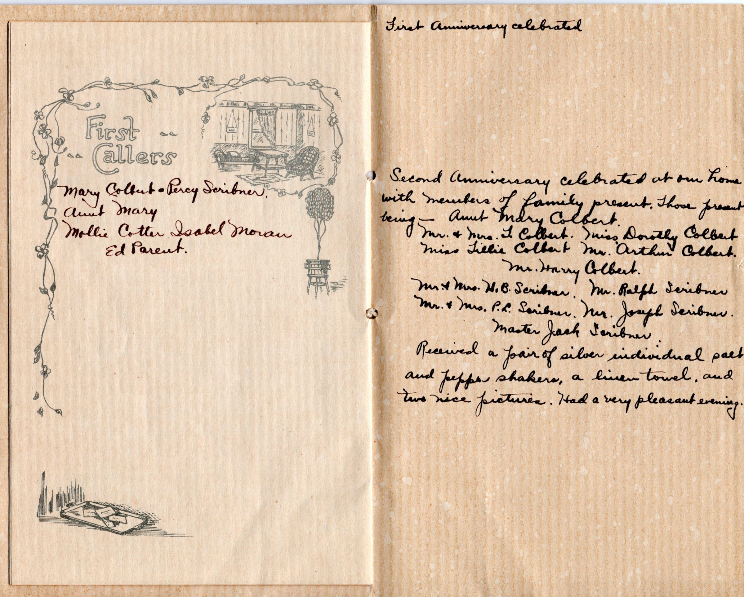 The booklet was locally printed by the J. C. Lincoln Co. of Willimantic, CT. The cover features a stock illustration of a young couple. The cover is cream colored, thin, embossed cardboard. The pages are cream colored heavy stock paper. A braided, tasseled string binds the spine on the left side. Page 1 is printed: it consists of good wishes from to printer to the couple. Interior pages feature (1) a list (presumably in Celia's handwriting) of the two attendants (Mary E. Colbert, Celia's mother, and Robert E. Johnson); (2) a list of guests (again in what is probably Celia's handwriting); (3) an extensive list of wedding gifts; (4) a list of upcoming wedding anniversaries (most of which, alas, the couple would not get to celebrate); (5) a "marriage record": the wedding took place at 4:00 p.m. on June 2, 1920, in the parsonage in Windham Center, CT -- it was a double ring ceremony officiated by Rev. Arthur W. Clifford and witnessed by Mary E. Colbert and Robert E. Johnson -- weather was fair [NOTE: the wedding was not held in the South Windham Congregational Church, but rather in the Windham Center "parsonage" (Congregational? Episcopalian?) about three miles away]; (6) a description of the couple's honeymoon (see below); (7) a page provided for a description of the couple's home (left blank); and (8) a list of first callers: Mary Colbert, Percy Scribner, Aunt Mary, Mollie Cotter, Isabel Moran, and Ed Parent. On the inside back cover is a description of the couple's second anniversary in Celia's handwriting: "Second Anniversary celebrated at our home with members of family present. Those present being -- Aunt Mary Colbert, Mr. & Mrs. L. Colbert, Miss Dorothy Colbert, Miss Lillie Colbert; Mr. Arthur Colbert, Mr. Henry Colbert, Mr. & Mrs. H. B. Scribner, Mr. Ralph Scribner, Mr. & Mrs. P. L. Scribner, Mr. Joseph Scribner, Master Jack Scribner. Received a pair of silver individual salt and pepper shakers, a linen towel, and two nice pictures. Had a very pleasant evening."