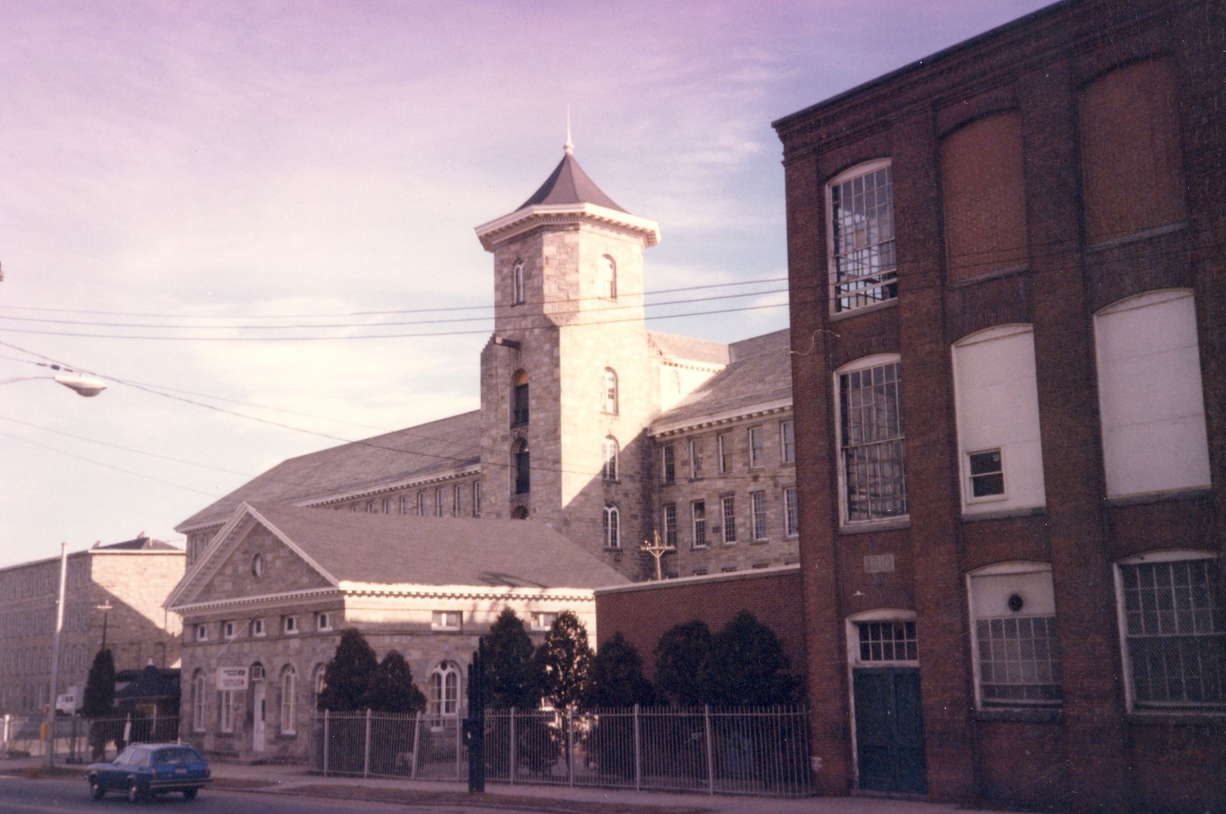 Color photographic print of Mill No. 2, stone office building, and brick dye house, American Thread Company, Willimantic, CT. Unknown photographer. Taken c. 1987, shortly after ATCO closed its Willimantic plant.Photograph Details