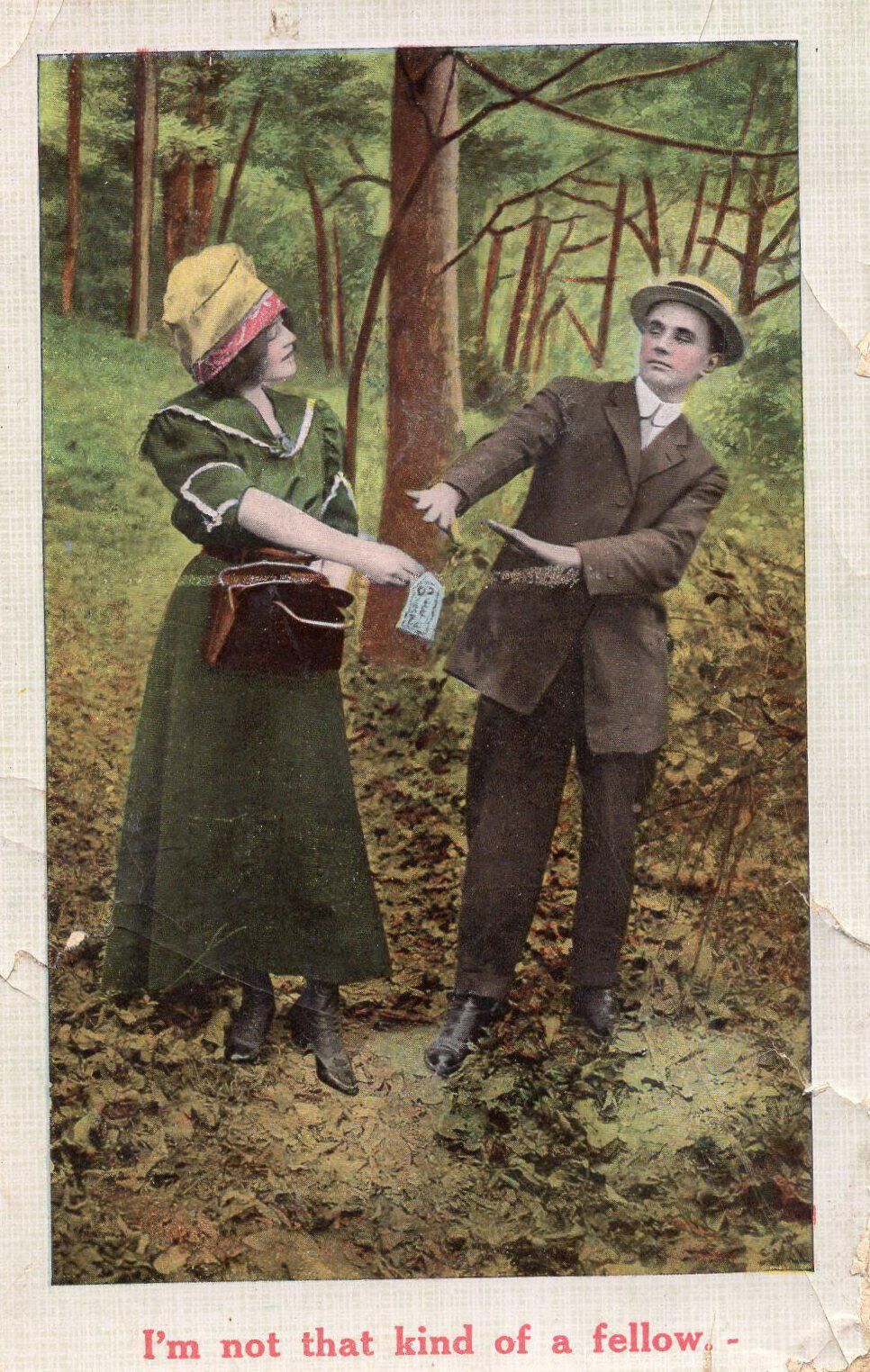 A postcard of a couple in the forest with the words "I'm not that kind of a fellow" printed on it.Condition