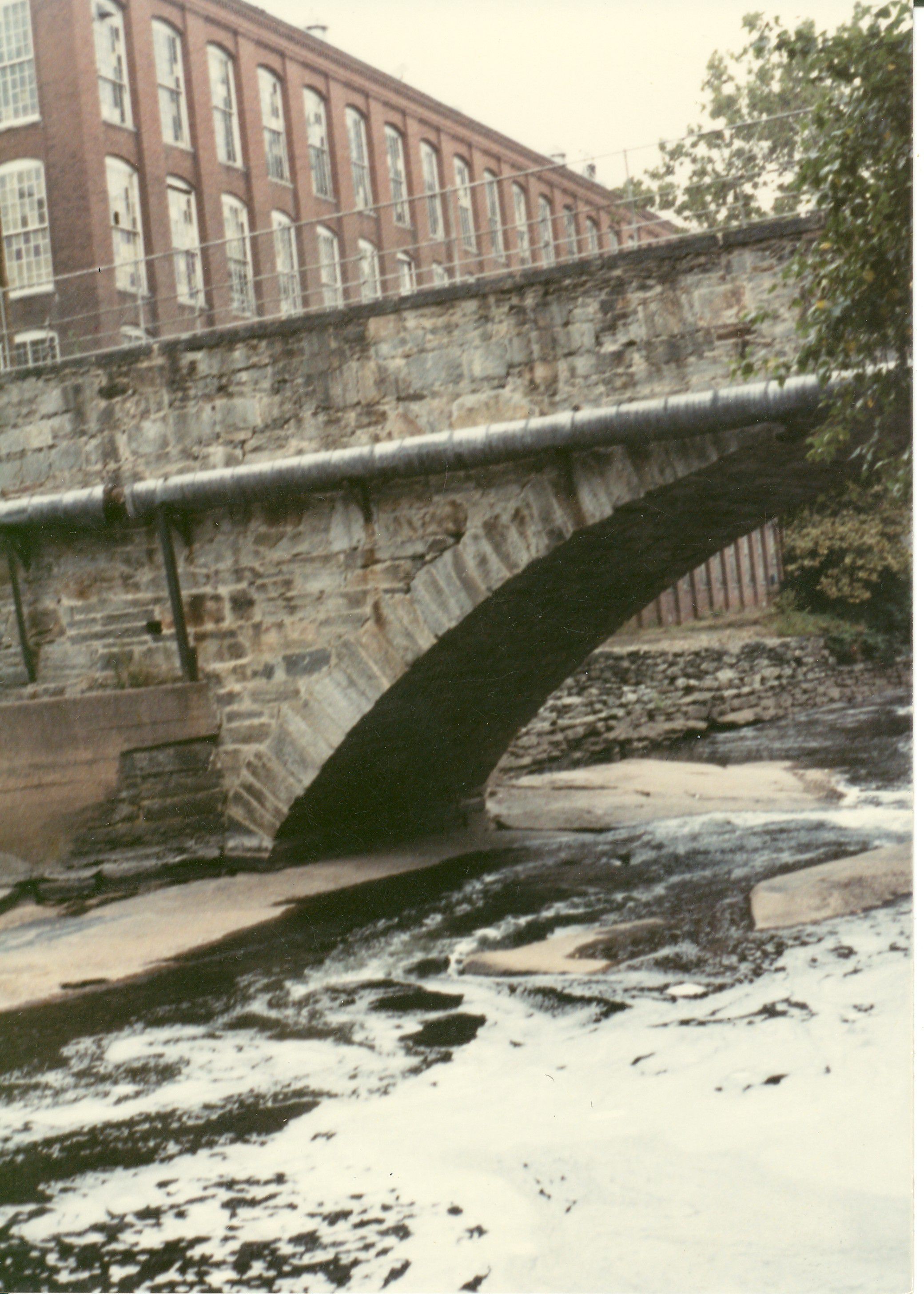 Color photographic print of the stone arch bridge over the Willimantic River that is now the Garden on the Bridge, Willimantic, CT. In the background is the American Thread Company's Mill No. 5. The water level in the river is very low. Looking east from the south bank of the river, just west of the bridge. Unknown photographer. Taken c. 1987, shortly after ATCO closed its Willimantic plant.Photograph Details