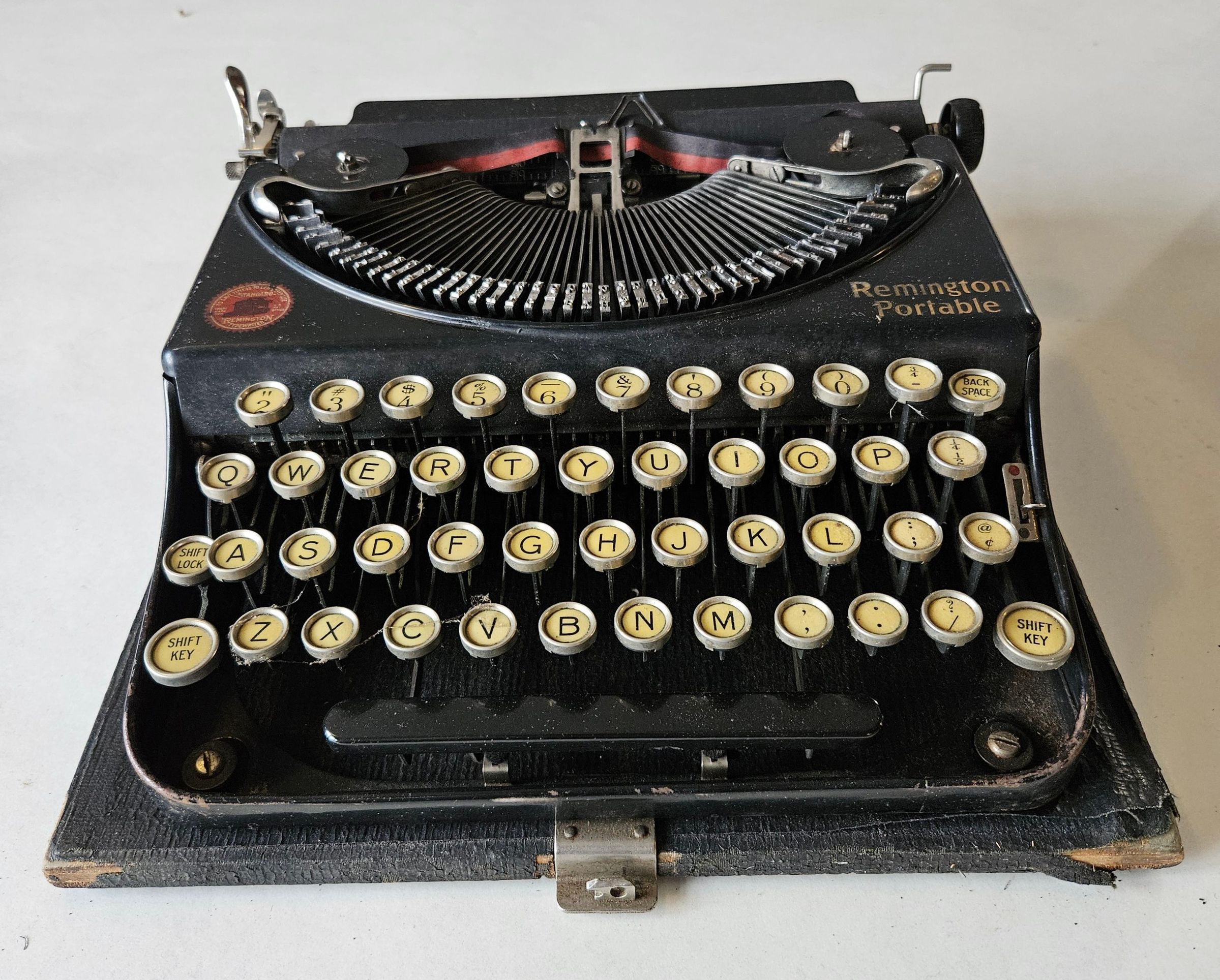 Remington portable typewriter. Standard ND57979. Black. Includes two-color nylon ribbon. With case. Both case and typewriter are black. Donor Charles E. Larkins said the typewriter belonged to his mother, who worked for the American Thread Company in the early 1940s.Manufactured 1925, according to Remington Typewriter Model Serial Number Database, https://typewriterdatabase.com/remington.42.typewriter-serial-number-database.Collection
