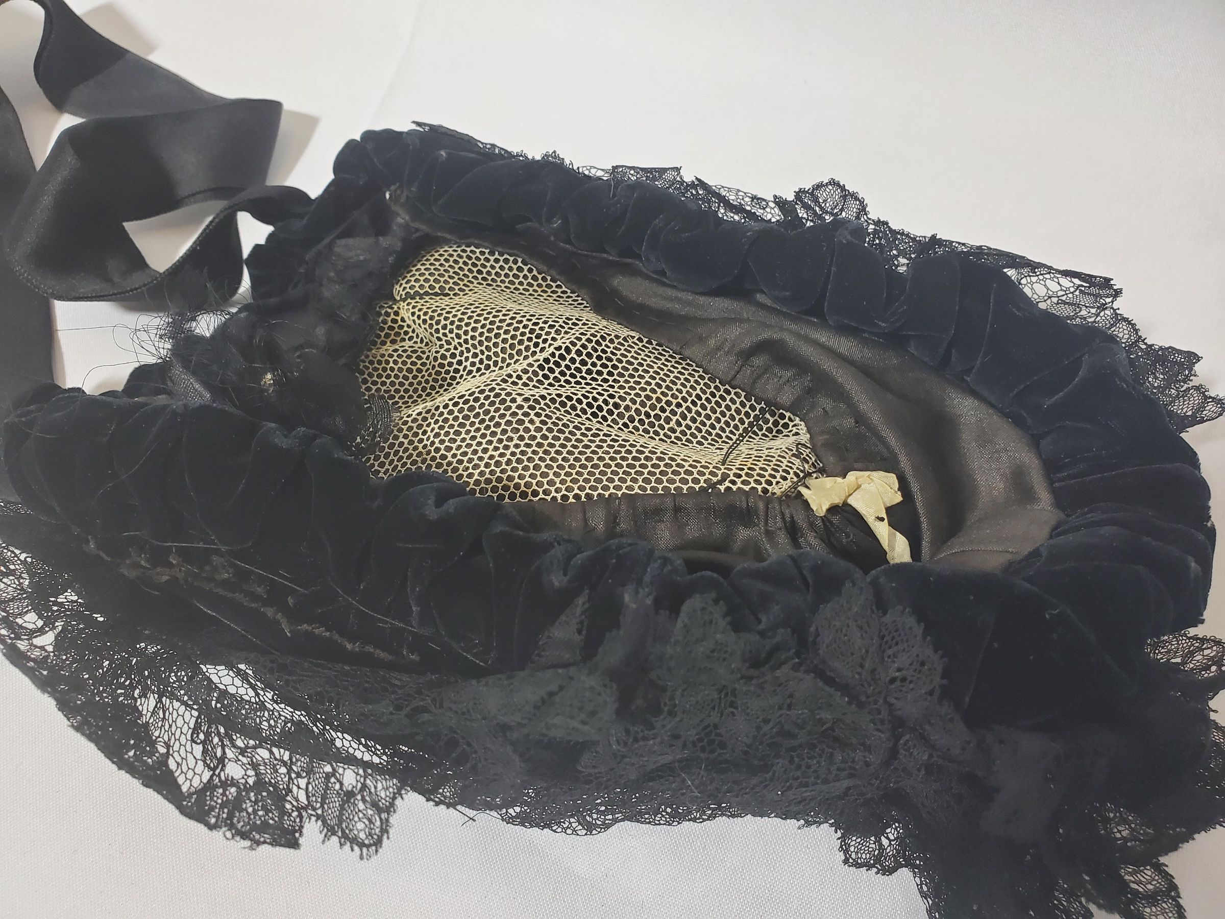 Velvet Victorian styled small hat with silk ribbons and netted lining. Waxed cotton is also stitched along the inside. Gloves are small and made out of lace.Use