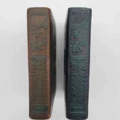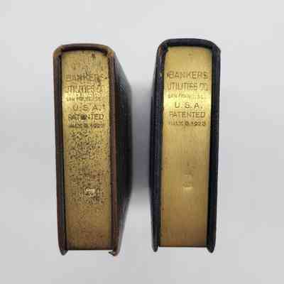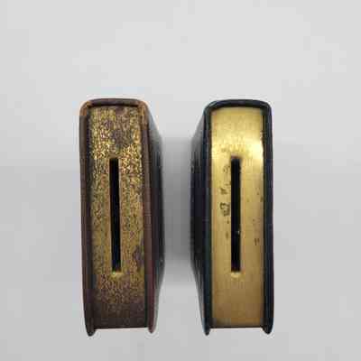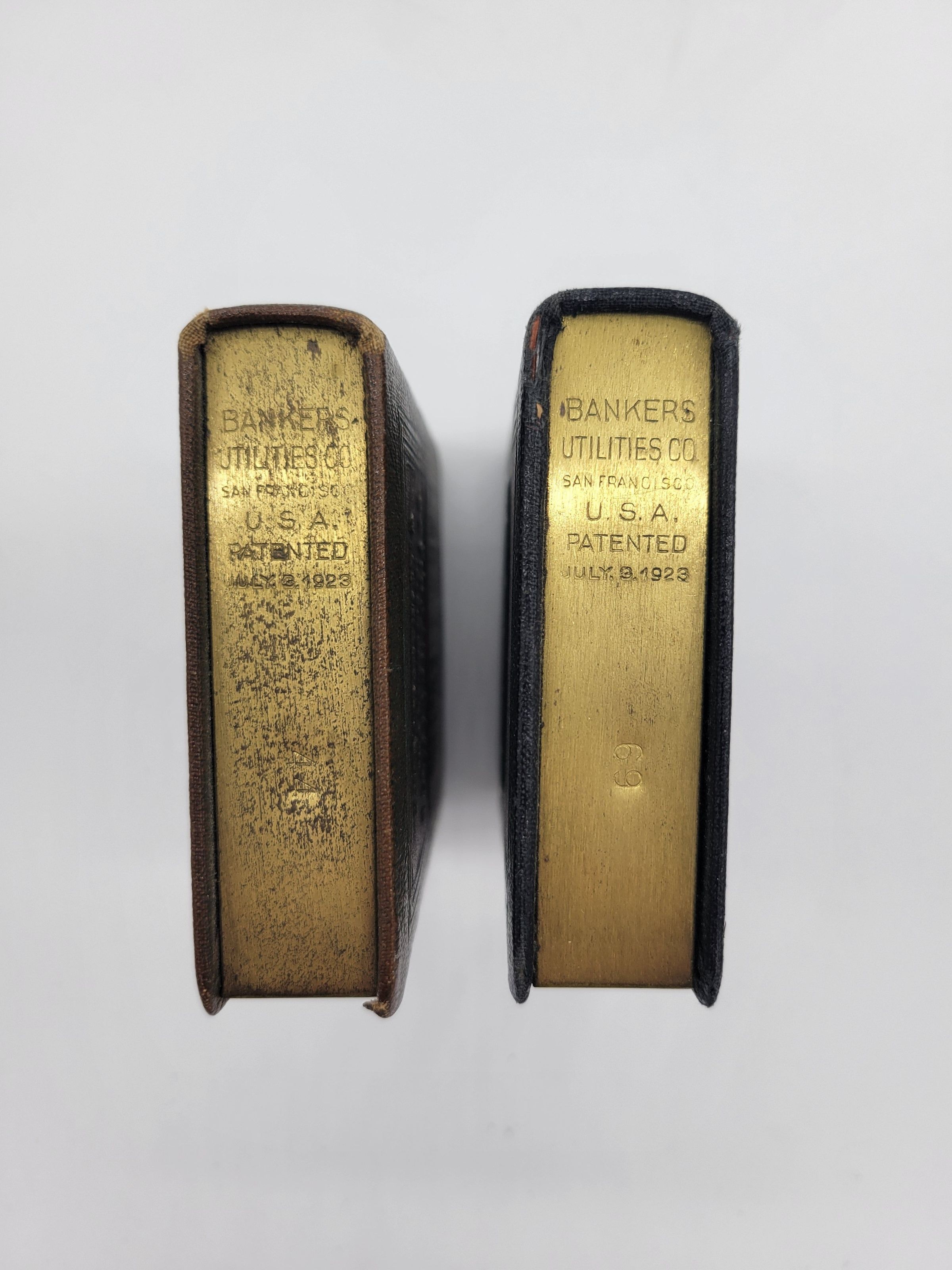 Two brass leather covered coin banks from the Willimantic Savings Institute of Willimantic, CT; one is brown with green detail, the other is dark blue with green and gold detail. Two two books are embossed identically with a picture of the bank and "WILLIMANTIC SAVINGS INSTITUTE/ INCORPORATED 1842/ WILLIMANTIC, CONN." on the front. the leather covered edge says "BOOK of THRIFT" and features a column with wings at the top, and the roman numeral VIII at the bottom. The other edges are plain brass, the top with a slot for coins and notes, the side with a keyhole for opening, and on the bottom is written "BANKERS UTILITIES CO./ SAN FRANCISCO/ U.S.A./ PATENTED/ JULY, 3, 1923"Use