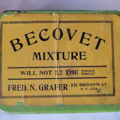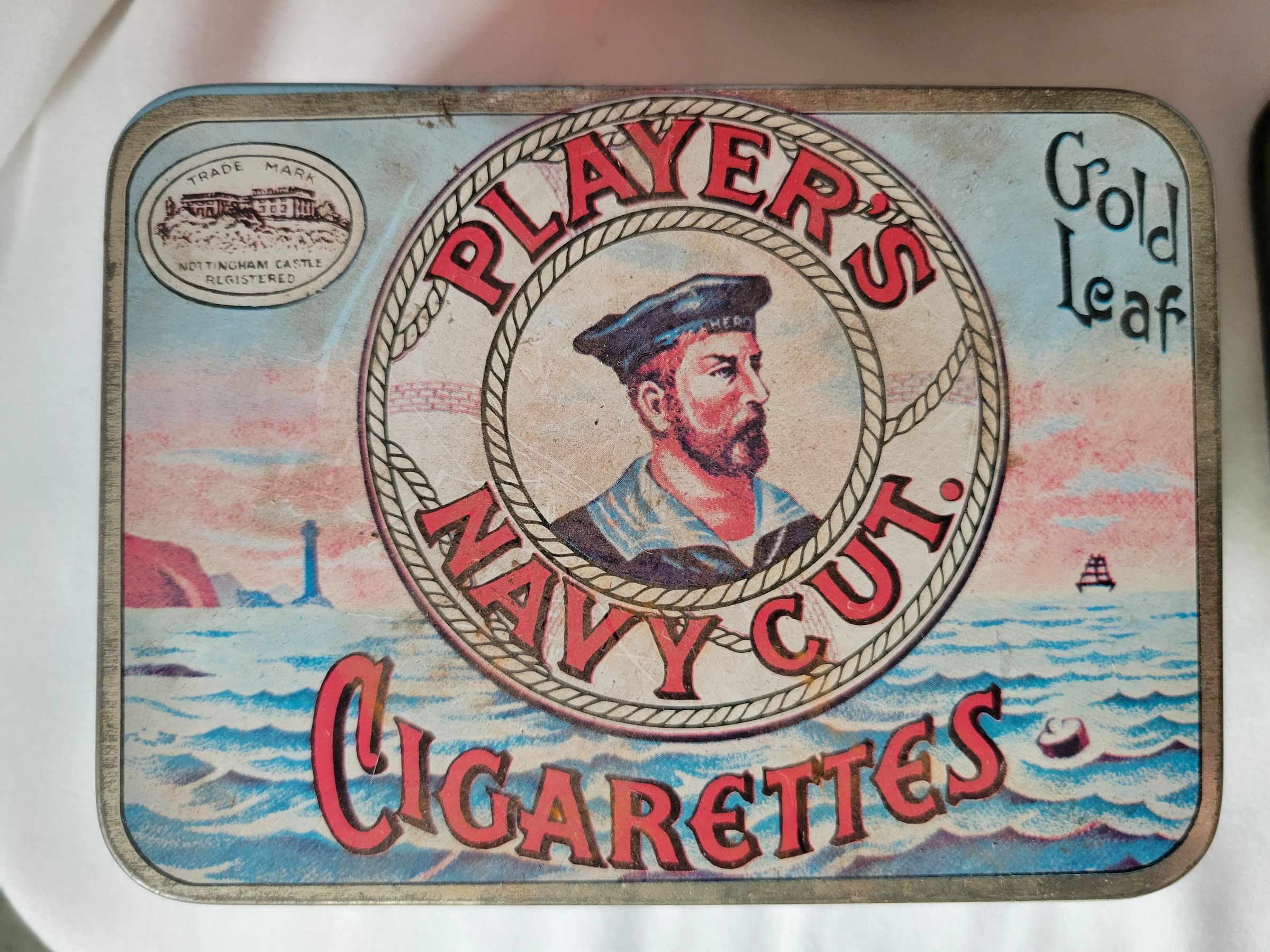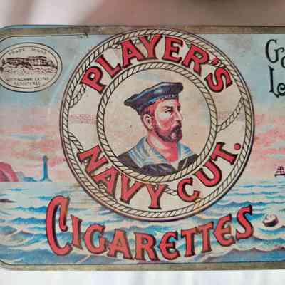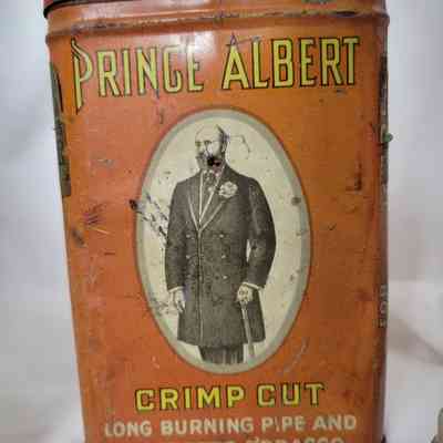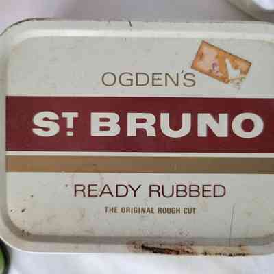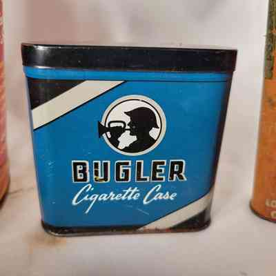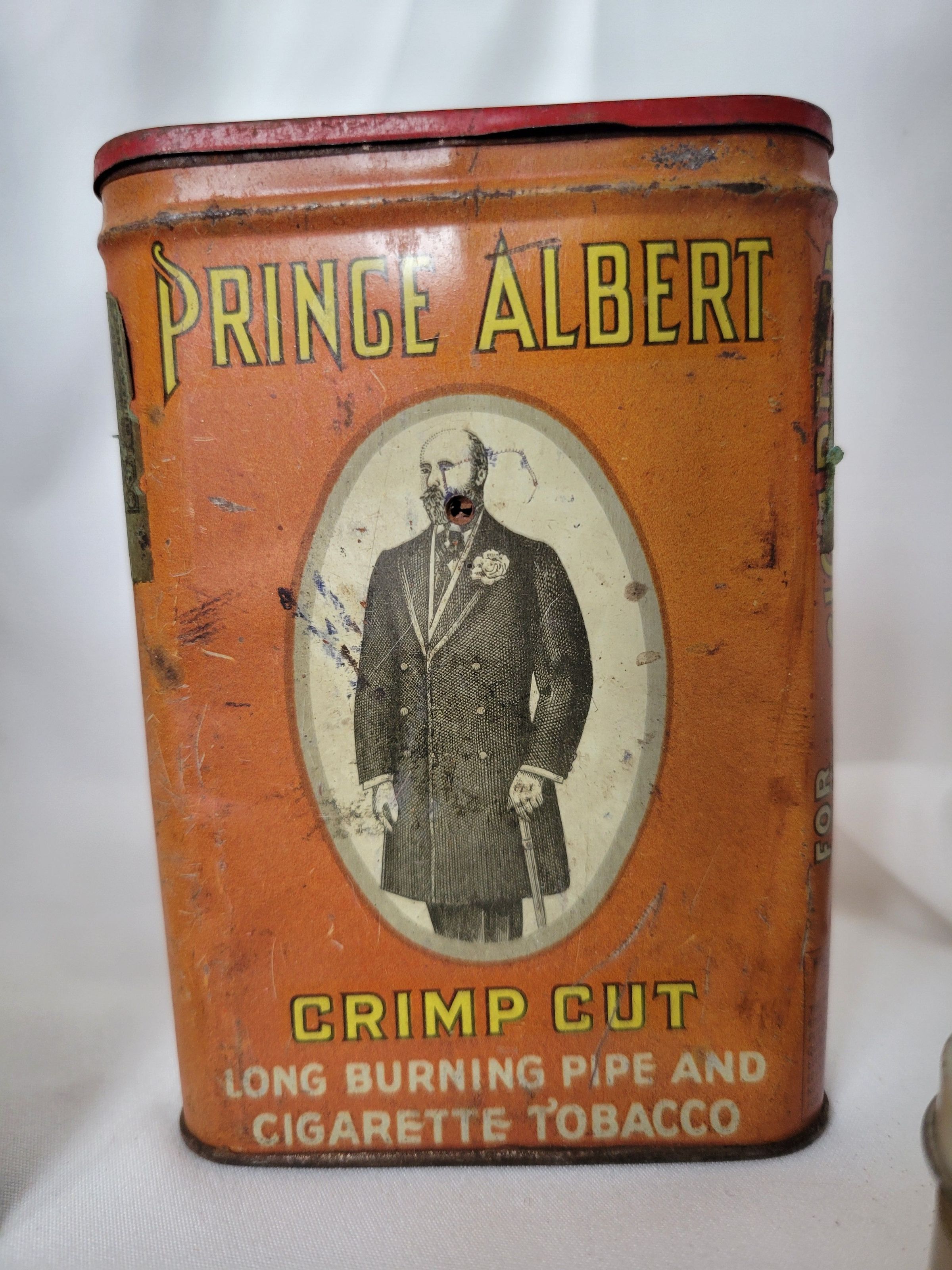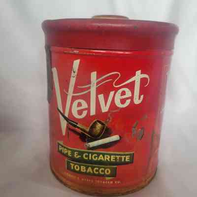A collection of tin containers which once held tobacco and/or cigarettes. The tins are in fairly good shape with minimal rust, with the exception of the red "Velvet" tin whose bottom is entirely rusted. All the tins are circa 1950 except for the blue "Player's Navy Cut" and Prince Albert containers which are circa 1920.Collection