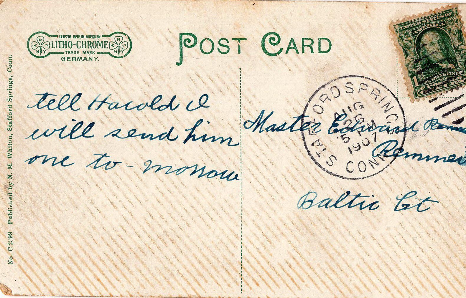 A postcard from Main Street in Stafford Springs, Con, 1907.Collection
