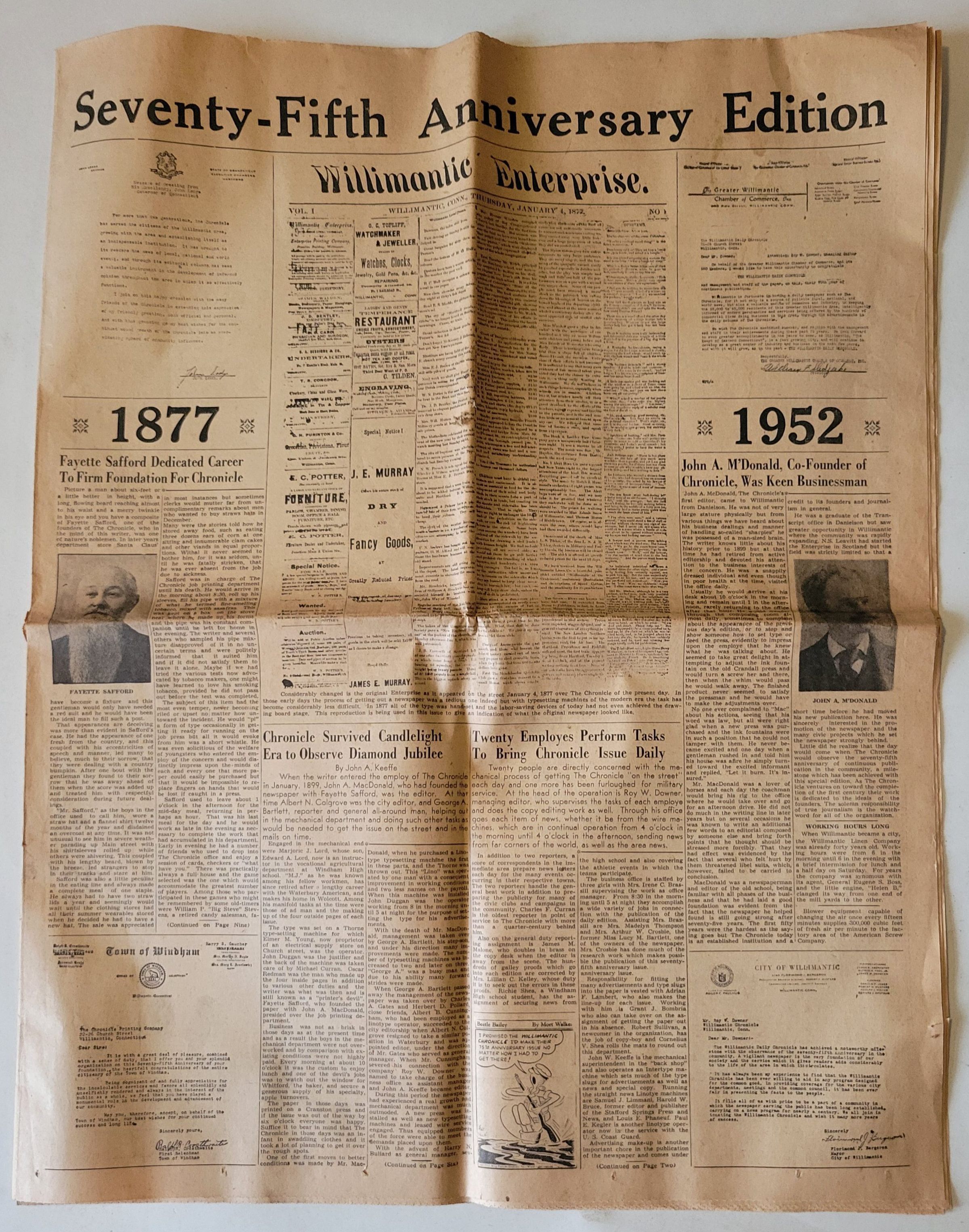 75th Anniversary Edition of the Willimantic Daily Chronicle, 1952. The Chronicle was established in 1877 as the Willimantic Enterprise, this 1952 issue details the paper's history since then.Collection