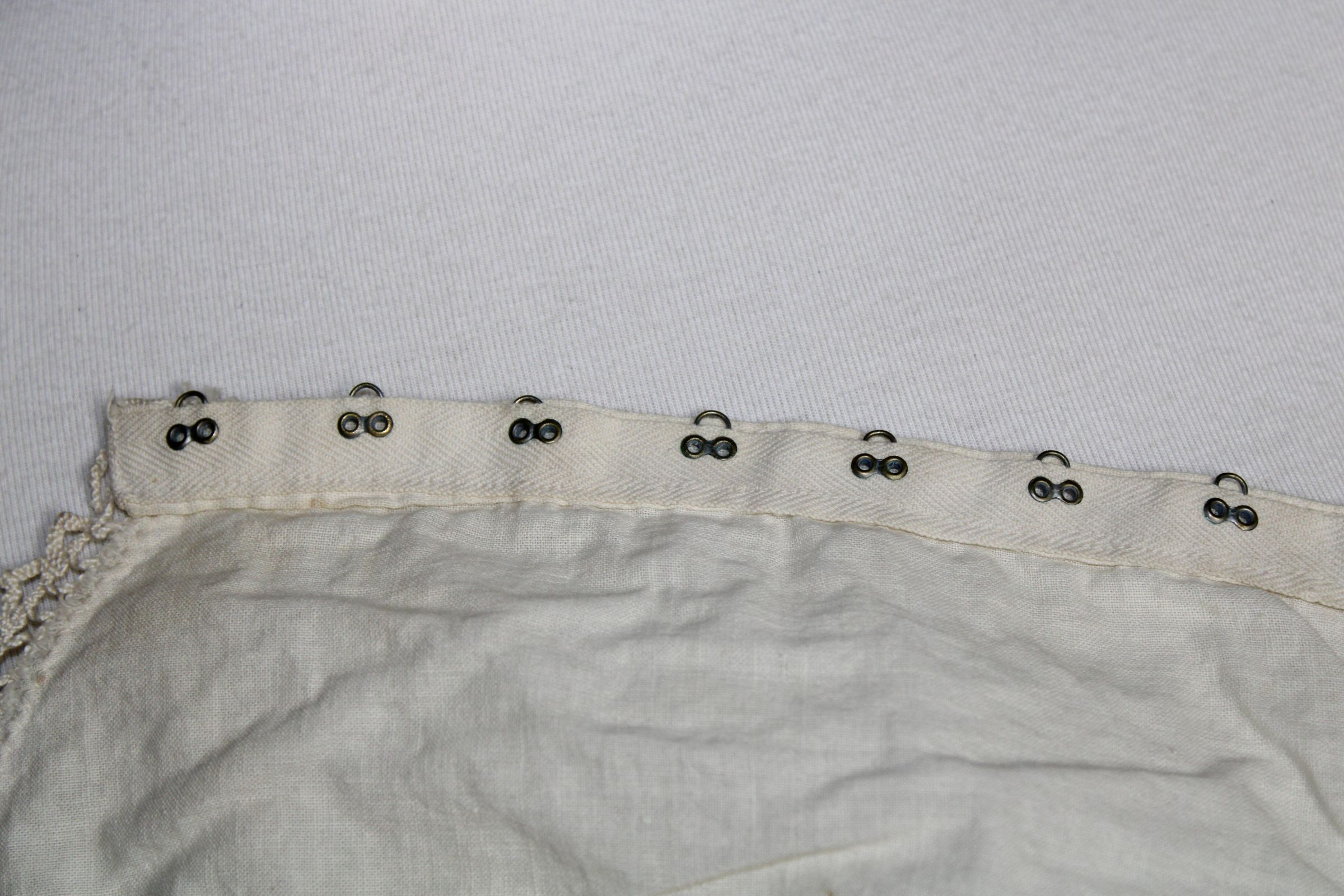Bralette decorated with lace trim. Hook and eye tape used for closure (pat. 1927). Underarm padding inserted with machine zig zag stitch.Collection