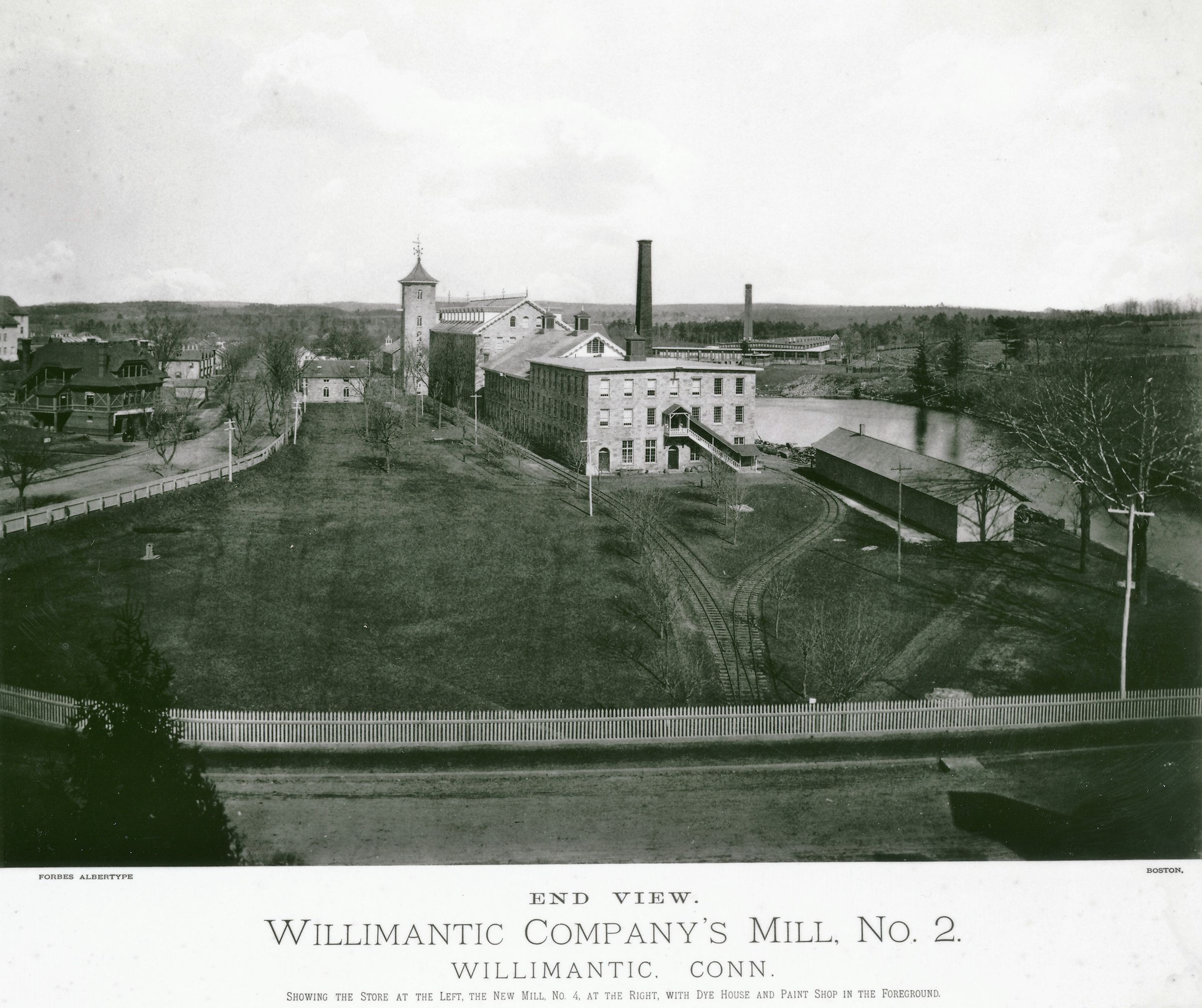 Copy of black and white photographic print of the Willimantic Linen Company's Mill No. 2, end (west end looking east) view, Willimantic, CT. The recent landscaping in the foreground, on the opposite side of the Willimantic River, indicates that Mill No. 4 had just been built; Mill No. 4 was built in 1880. The photo also shows the Linen Company's store, built in 1877. The photo is captioned, and so appears to have been copied from a publication. The captions read "End View, Willimantic Company's Mill No. 2, Willimantic, Conn., showing the store at the left, the new Mill No. 4 at the right, with the Dye House and Paint Shop in the foreground," "Forbes Albertype," and "Boston." The Forbes Albertype Co. was located in Boston, MA, and flourished between 1856 and 1901, specializing in both albertype photographic prints and lithographs, in the form of art prints, maps, guidebooks, and trade cards. This photographic print is probably from c. 1881, a peak year for the Forbes Company.Photograph Details