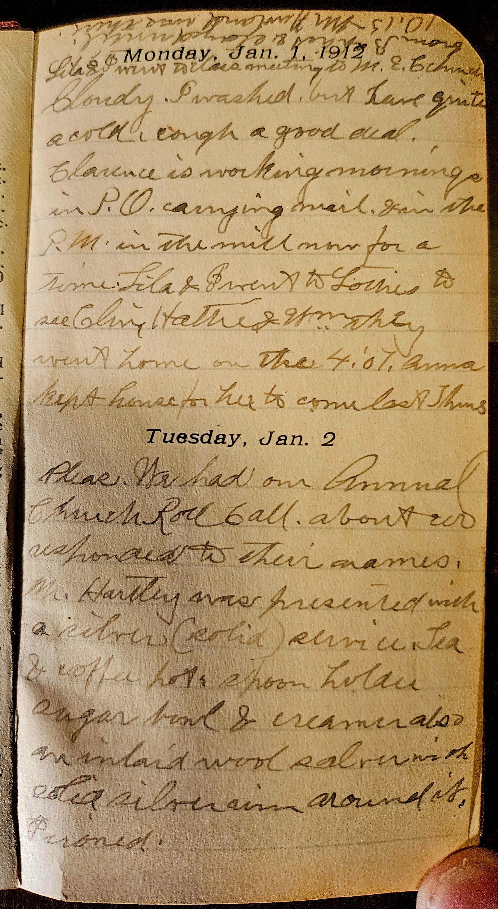 Handwritten diary of Martha N. (Perkins) Barrows of Willimantic, CT. 1912. Printed, two-entries-per-page daily diary for 1912. Includes monthly "cash account" pages in the back. Martha N. Perkins was born in 1860 in Mansfield, CT. The 1880 U.S. Census shows her, age 19, living with her parents in Mansfield. She married Oscar Bernadotte Barrows, also of Mansfield, in c. 1885. Both the Perkins and Barrows families had levied in Mansfield for several generations. The 1910 U. S. Census shows Oscar and Martha Barrows living in Willimantic at 19 Lincoln Avenue in a rented home. Oscar was a watchman, employed by The Willimantic Machine Company. The Willimantic Machine Company was located at 95 Milk Street. It had been incorporated on April 20, 1899, and in 1912 had capital of $50,000, which made it one of Willimantic ten largest businesses. The President was George E. Stiles and the Secretary/Treasurer was E. H. Holmes. In 1910, the Barrows household also included Martha and Oscar's son, Clarence O. Barrows, 24, a letter carrier for the U.S. Post Office, and Lila Simonds, 26, an inspector at the "thread mill," which probably meant The American Thread Company. Martha did not work outside of the home. Oscar died only four years after Martha wrote her diary, in 1916, aged 59. Martha died in 1938, and is buried in the Old Willimantic Cemetery.Use