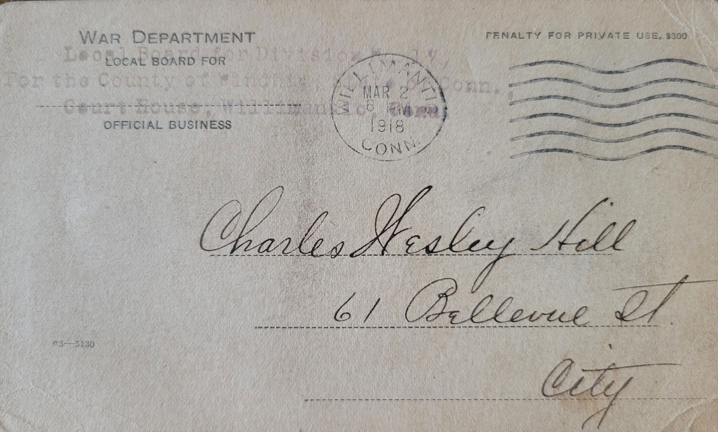 A card sent to Charles W. Hill from the War Department's Local Board for District 17 notifying him of his A-1 classification. This classification indicated that he was liable to be drafted. The card is dated as well as postmarked March 2, 1918.Collection
