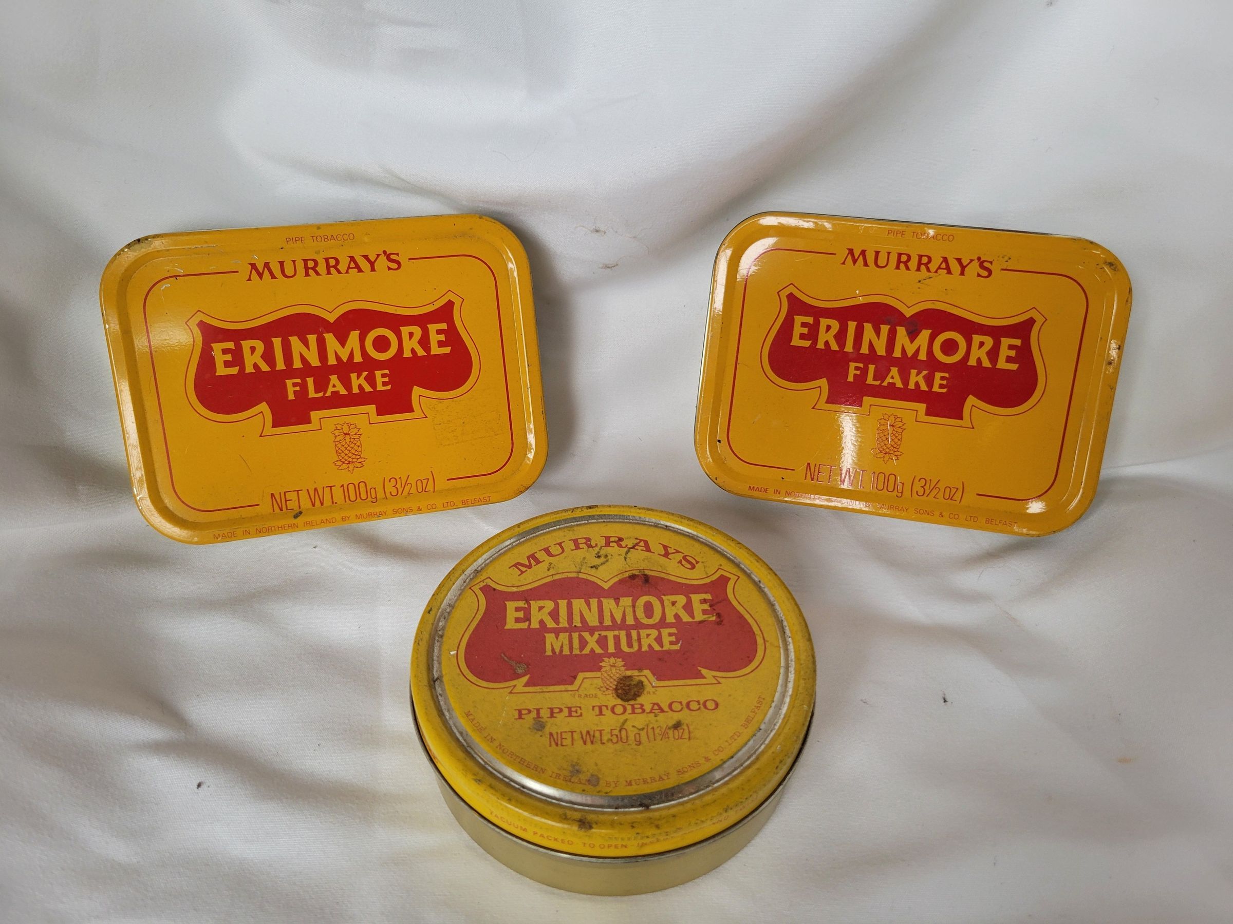 Three yellow and red tins, two rectangular and one circular, for Erinmore Flake tobacco and Erinmore Mixture tobacco. The Murray's brand began in 1812 in Belfast, Ireland and continued the brand through several ownerships until they went defunct in 2005. The tins are a little dirty with some rust spots but otherwise in good, working condition.Collection