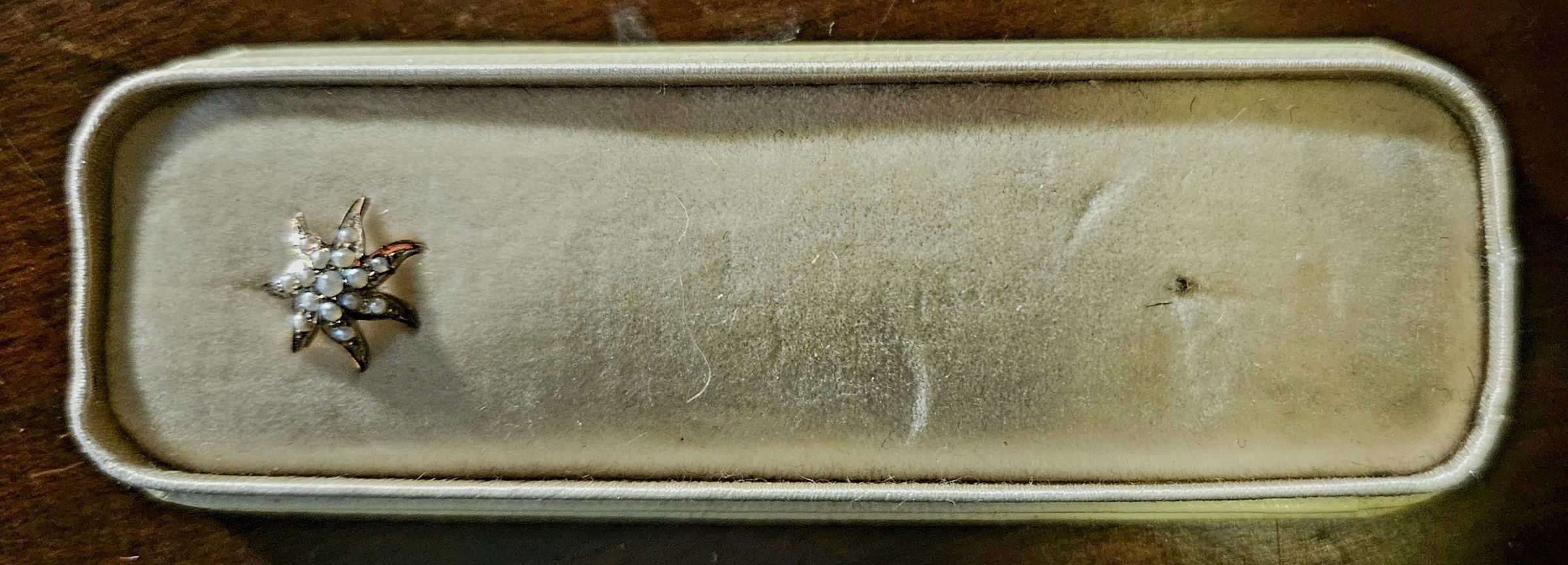 Gold and seed pearl tie pin in its original boxes. One box labeled "J. C. Tracy, Willimantic Connecticut, Jeweler."Context