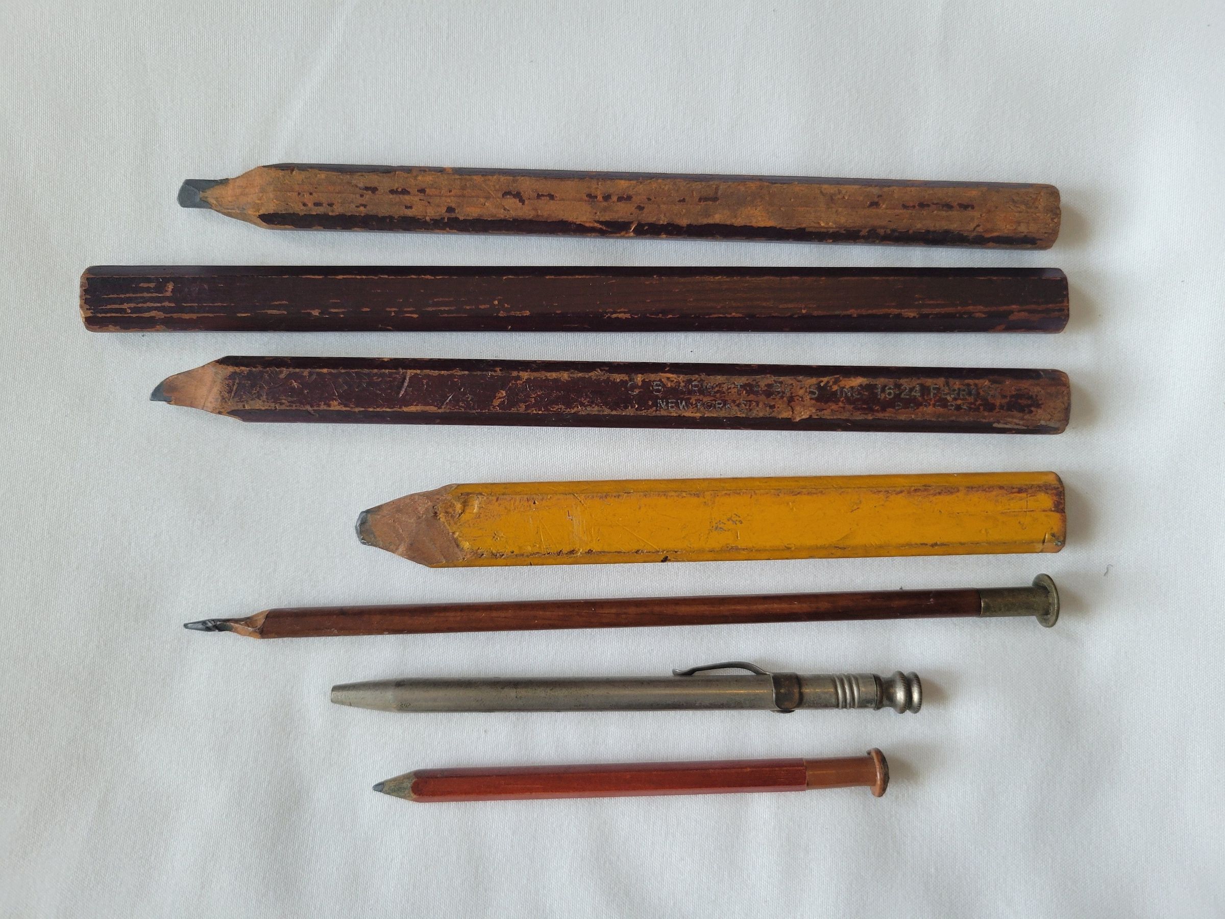 A collection of pencils used by a tailor, hand-sharpened with a knife except for the bottom two. The second from the top is unused and the second from the bottom is mechanical. The top three shown are marked "C.B. Hewitt & Bros. Inc. 16-24 Ferry St. New York City. Pattern Papers." C.B. Hewitt & Bros. was a wholesale paper, glue, and boards company between 1870 and 1967.Collection