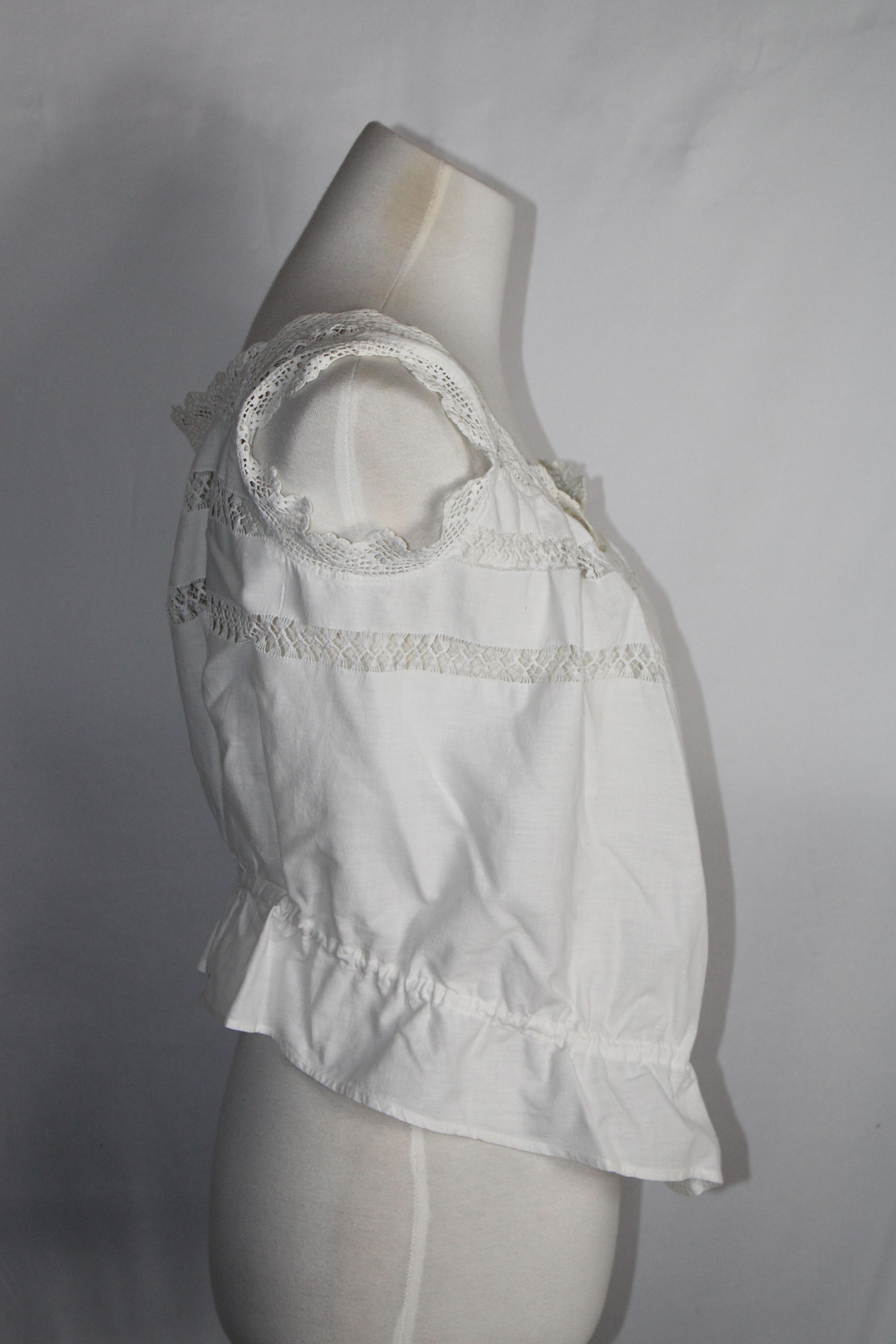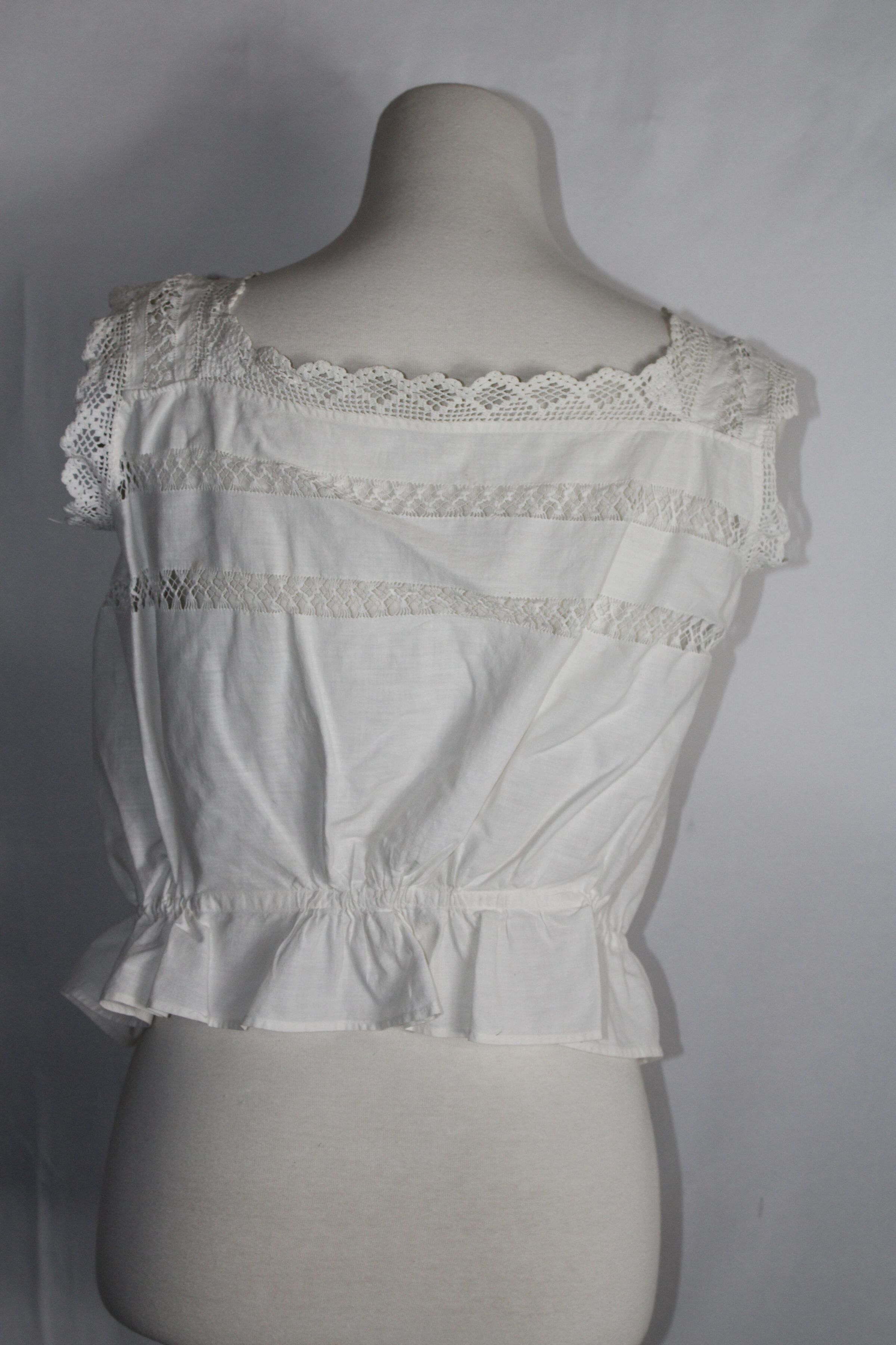 A white cotton poplin corset cover, most likely 1920s. Lace insertions and lace borer along neckline and sleeves. Drawstring at waist.Collection
