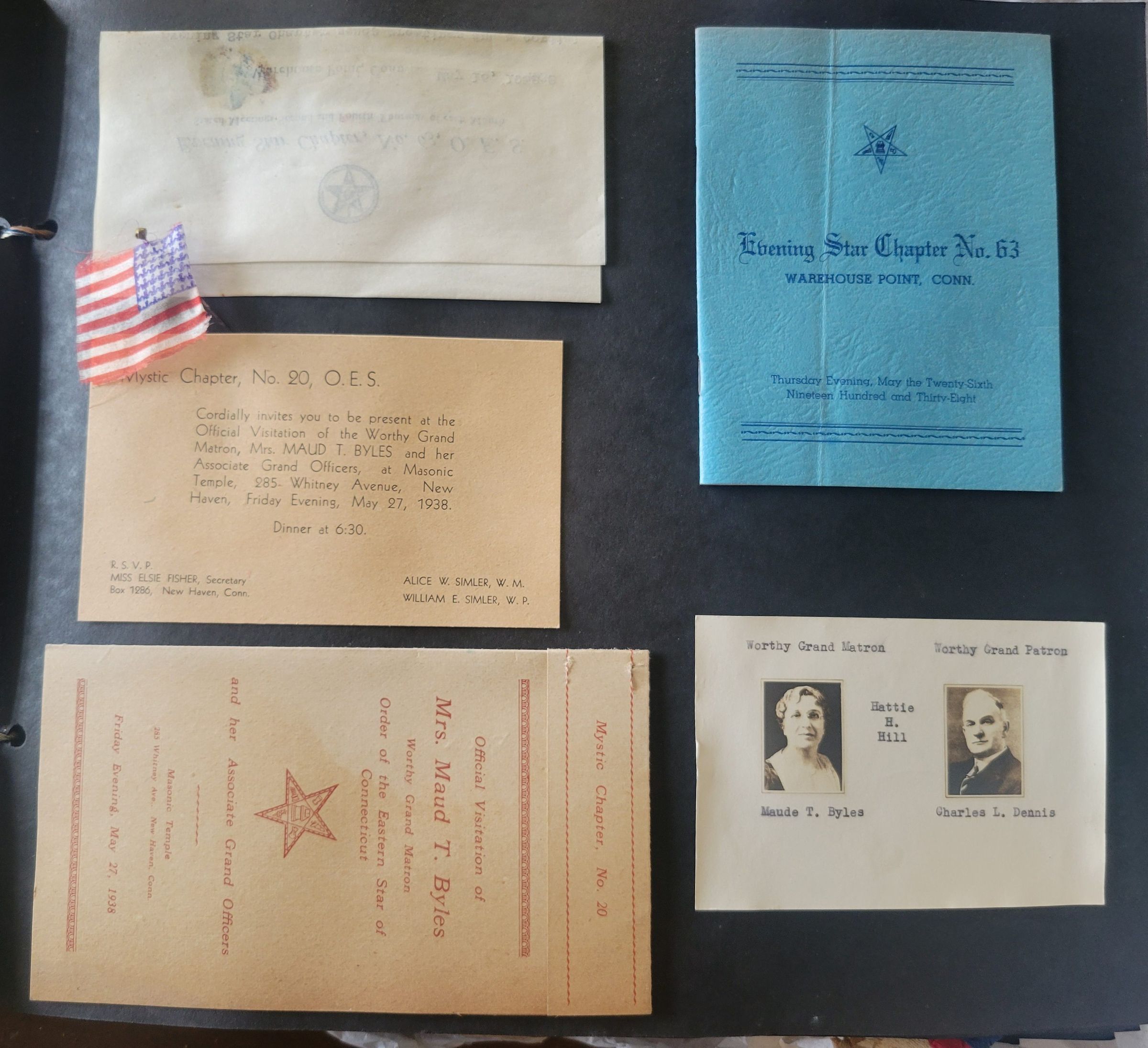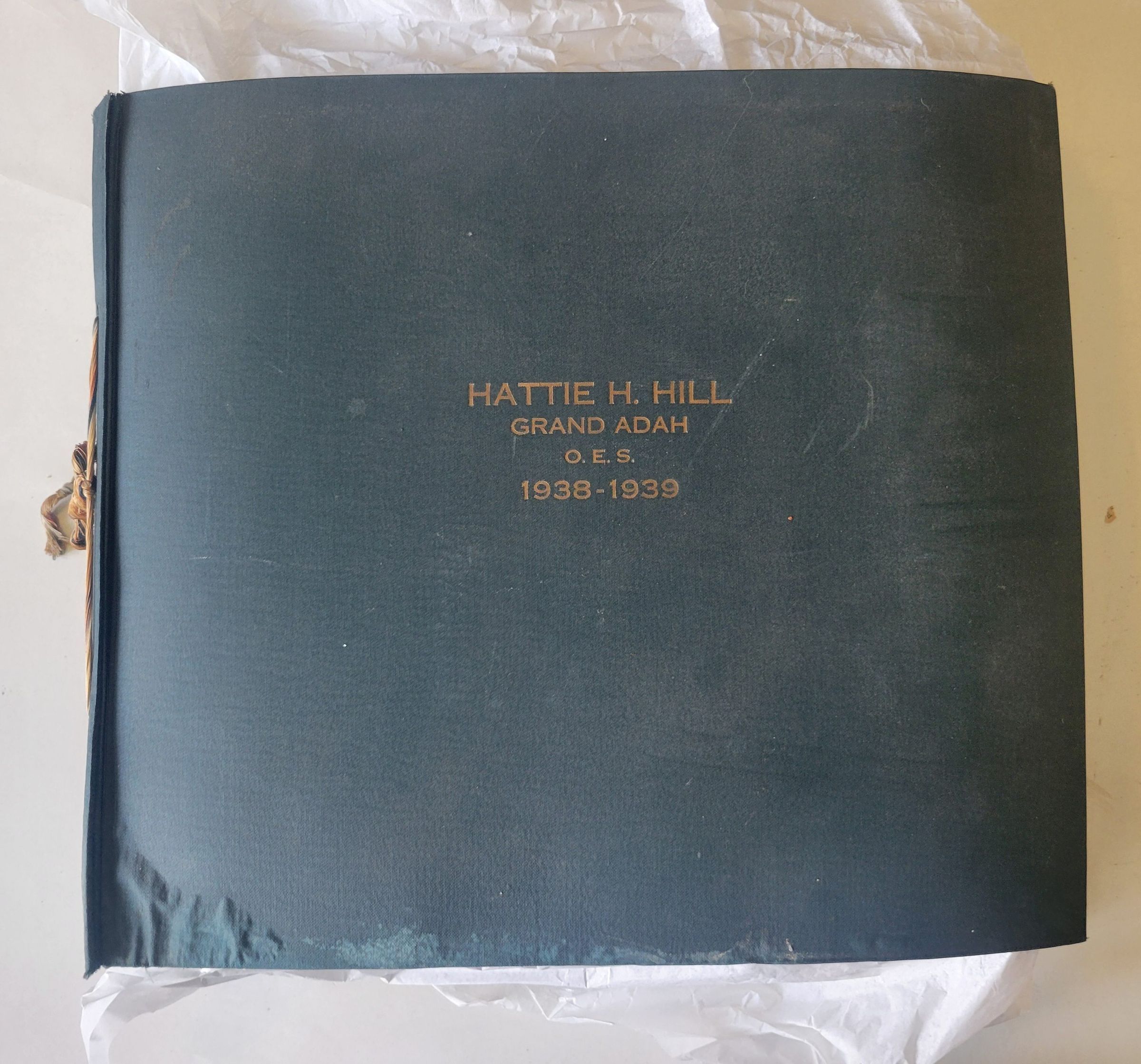 Scrapbook kept by Hattie H. Hill during her time as Grand Adah of the Order of the Eastern Star. Adah is a biblical figure who for the OES represents the virtue of obedience. The woman elected Grand Adah shares the lesson of Duty of Obedience to the will of God with the group at events. The scrapbook is dated 1938-1939 and contains ephemera from various OES events during that time such as invitations, place cards, programs, and favors.Collection