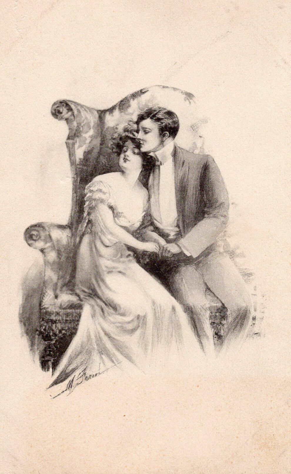 A black and white postcard of a couple sitting together in a chair.Condition