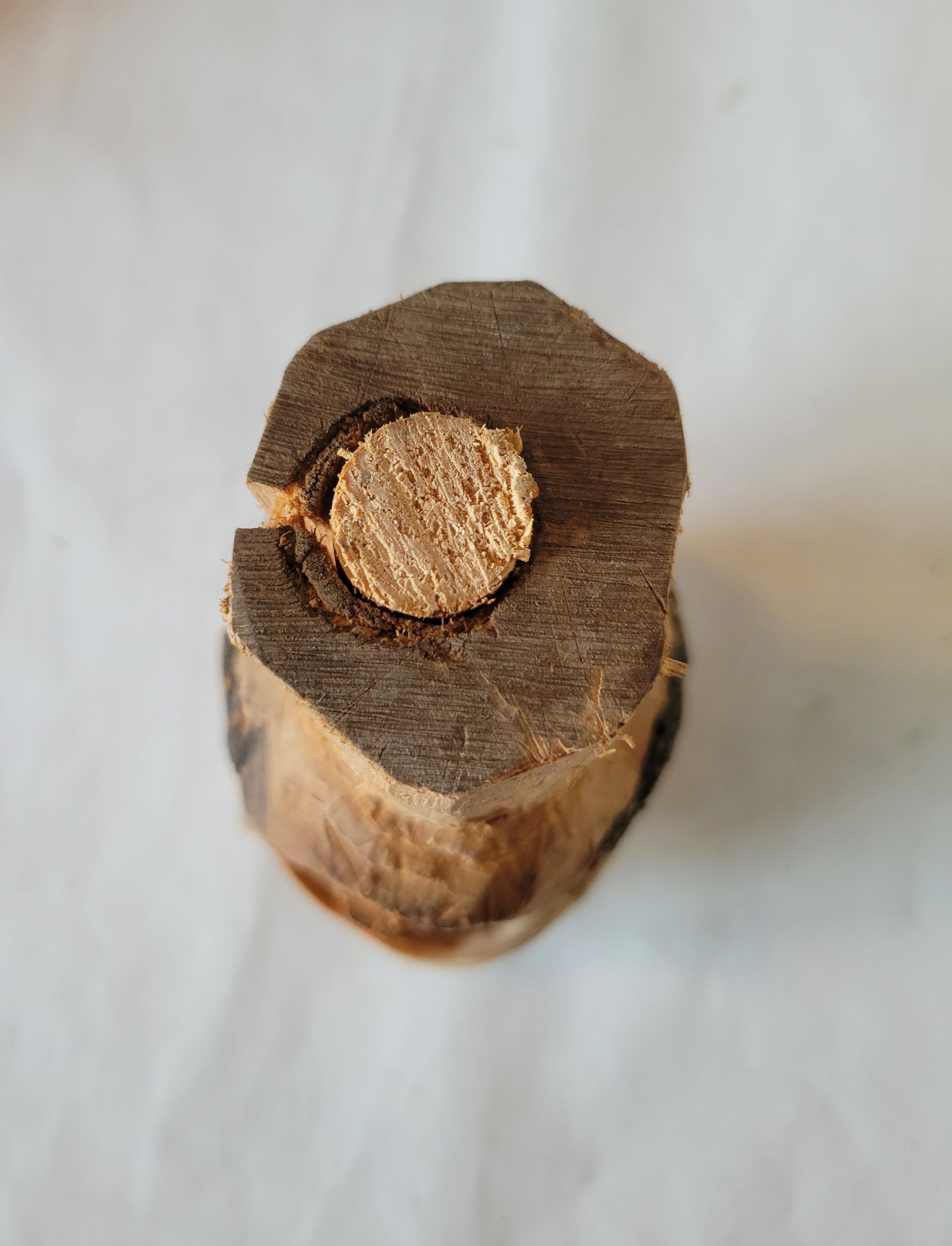 A roughly carved wooden head, about 8" long. It has dark brown painted hair, bright orange face paint, and a cloth wrapped around the top. It is split down the side and the base of the neck has a hole into which is wedged a wooden rod which has snapped off near the base of the neck.Collection
