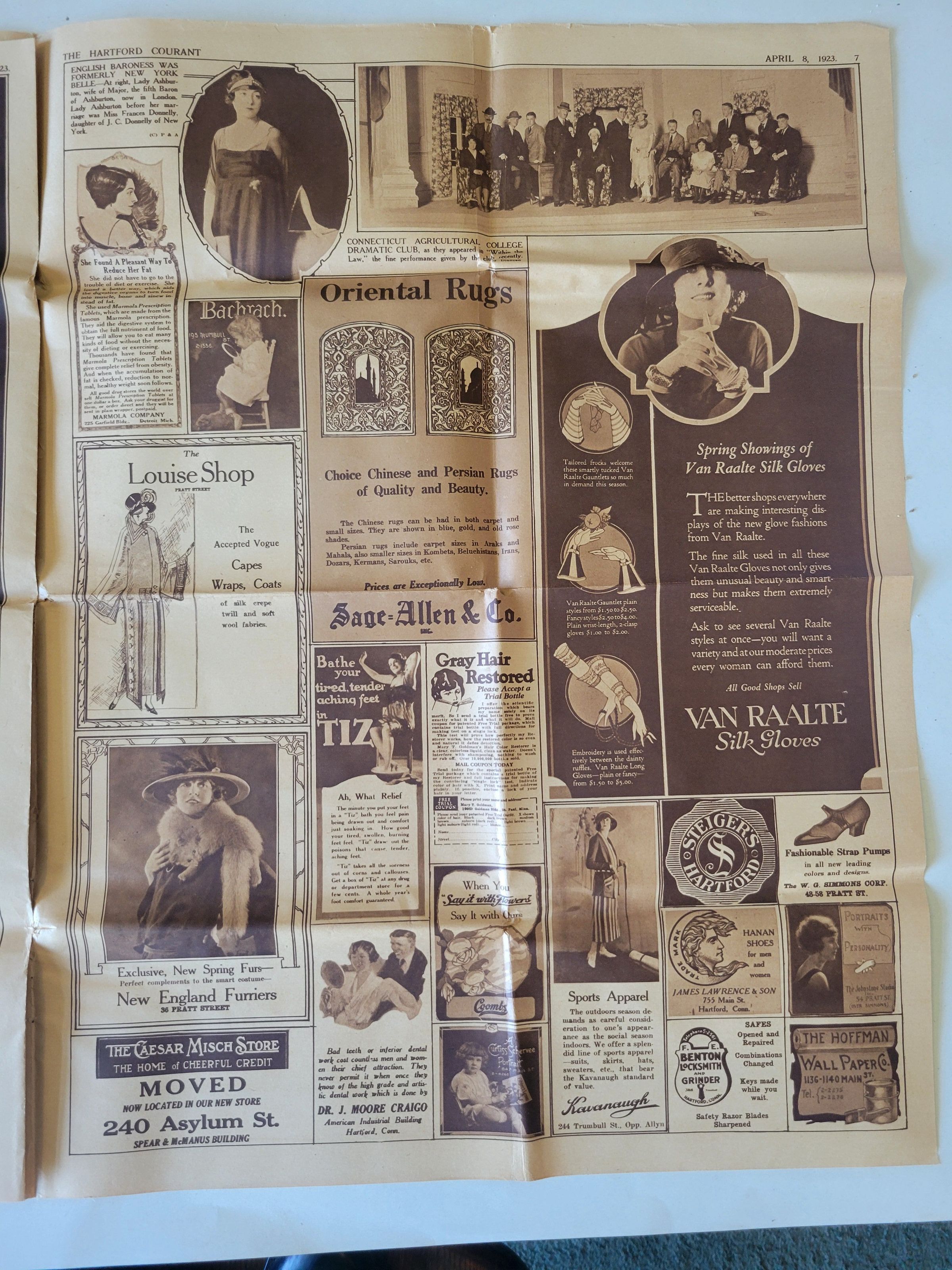The Artgravure section of the Sunday Edition of the Harford Courant, published April 8, 1923. Paper is yellowed with age with small tears. It is creased, having been folded in half three times.Collection
