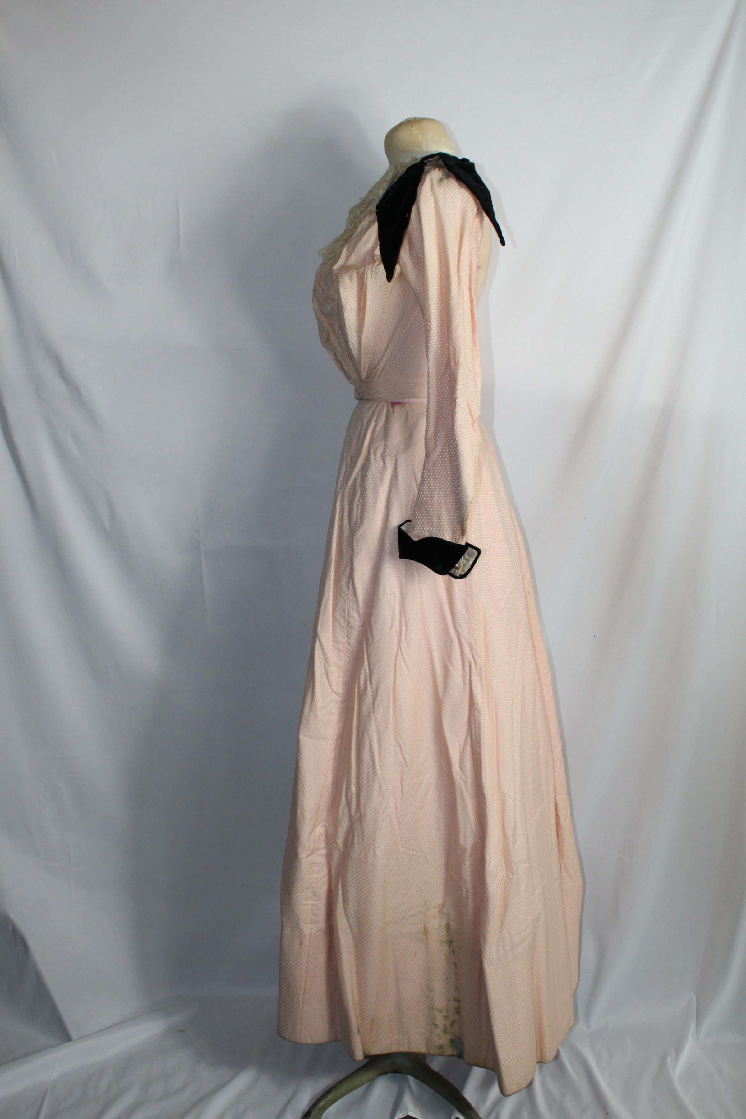 An Edwardian ensemble consisting of a bodice and skirt. Made of a pink figured silk with black silk velvet and lace details.Collection