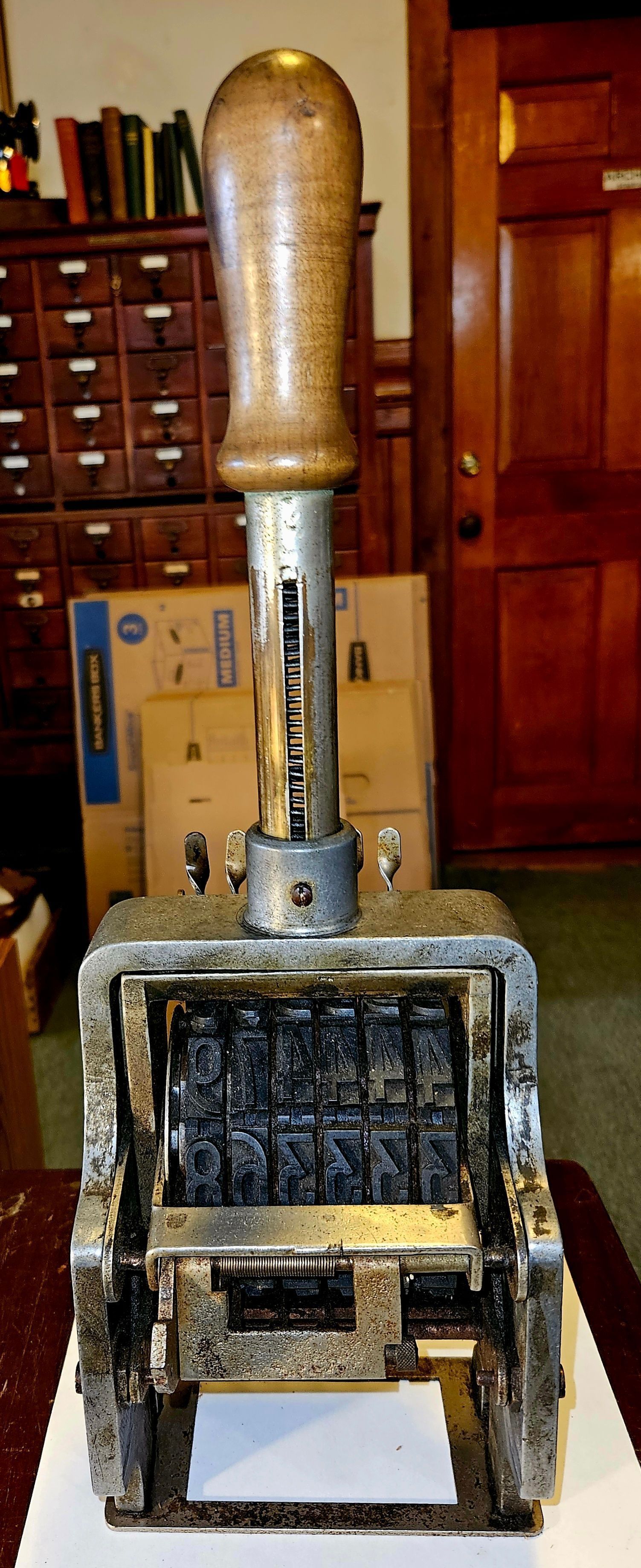 The image depicts a vintage metal numbering stamp with a wooden handle, set against a background featuring a classic wooden door, a cabinet with books, and a stack of cardboard boxes. The stamp has an intricate mechanism with visible numbered wheels in a metallic casing. Its robust design, evidenced by the wear and patina, indicates it has been used extensively, probably in an office or library setting. The wooden top suggests comfort and usability, showing signs of aging with a smooth, worn texture. The numbering mechanism, with its aligned digits, suggests functionality in organizing or categorizing documents, characteristic of earlier manual systems for administration and record-keeping.